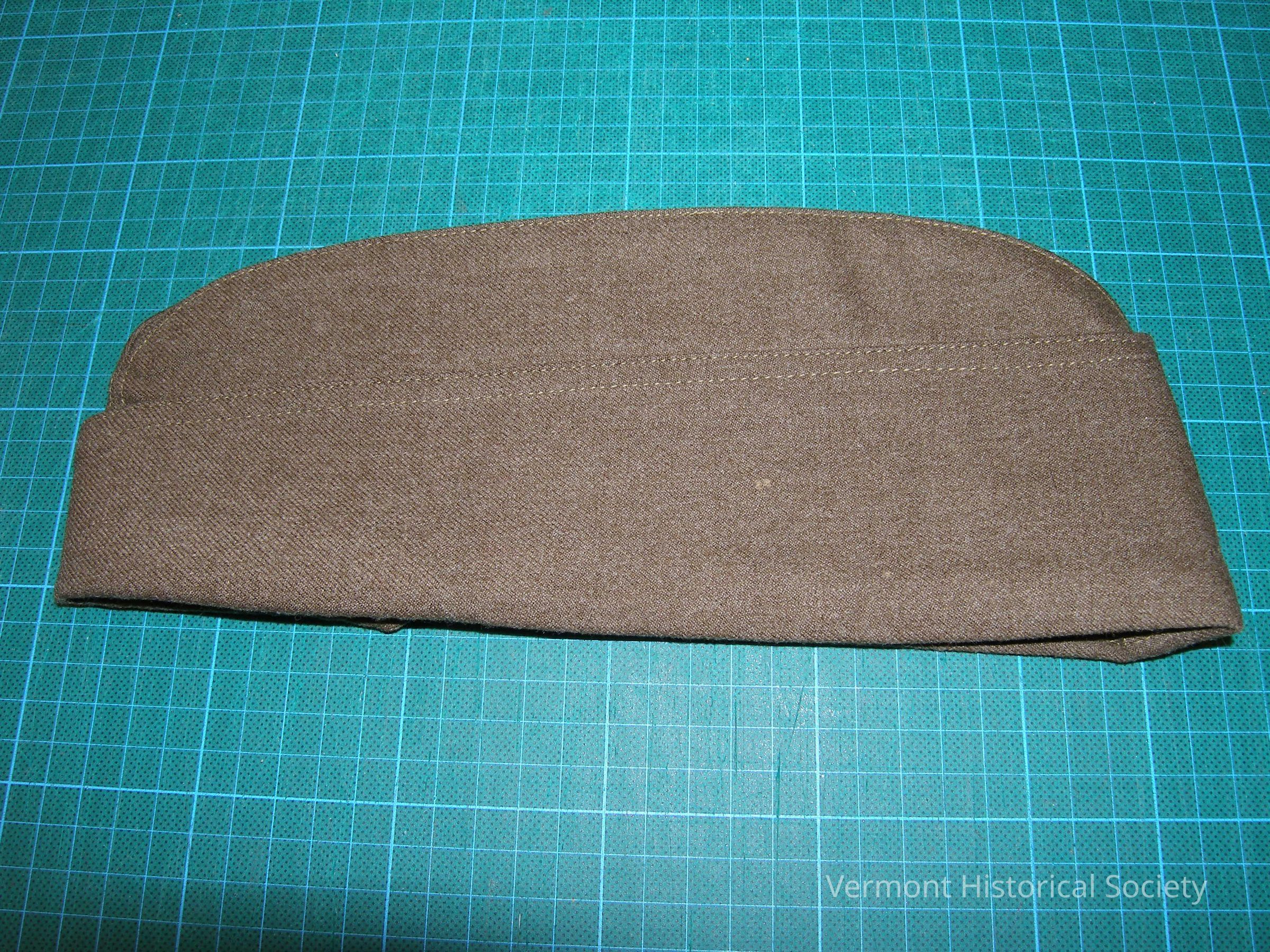Khaki wool garrison cap. A white label sewing onto the band reads, "Caps, Garrison, O.D. Durable Uniform Co . . . Inspector 7 1/8".