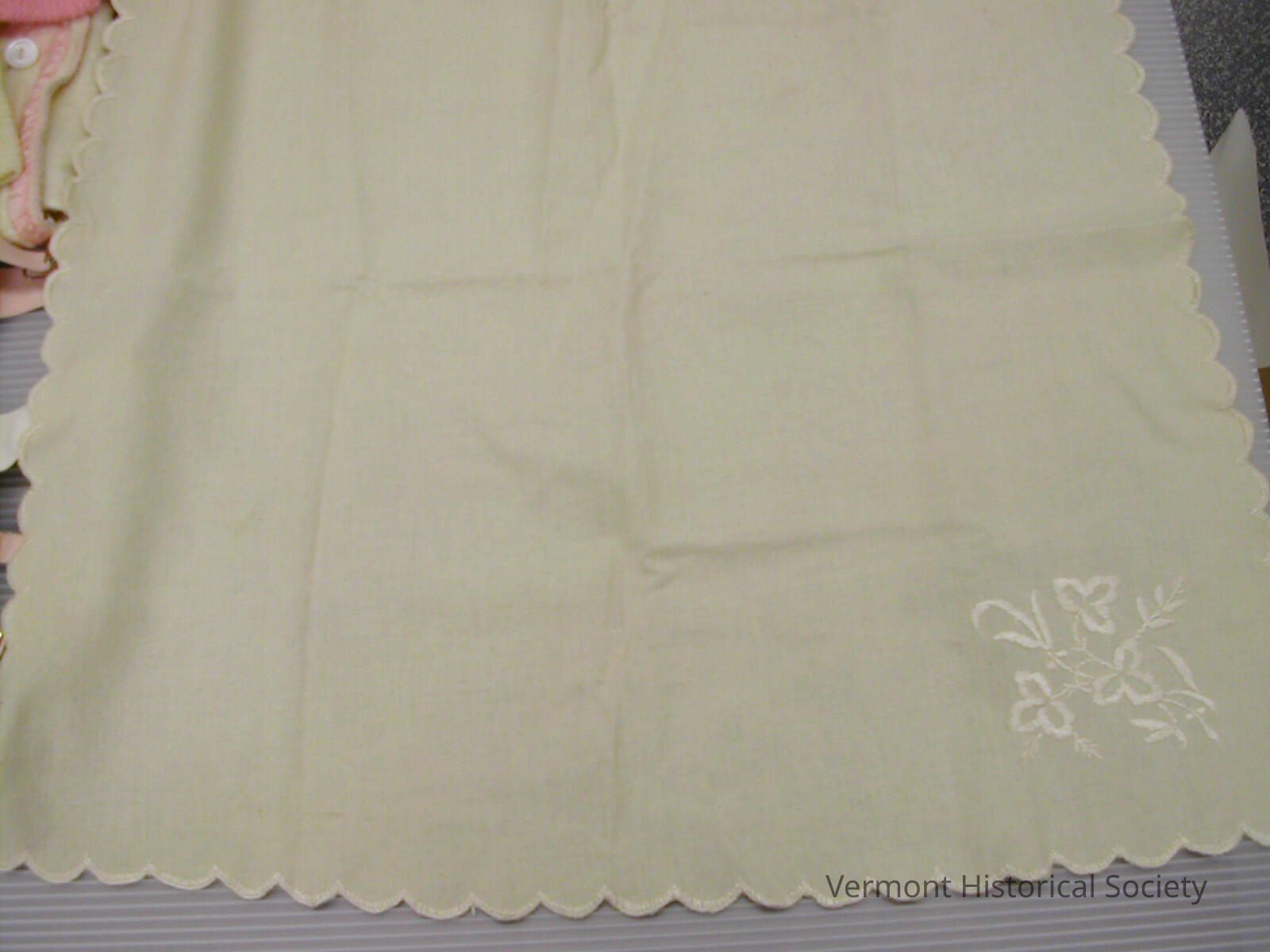 White wool baby blanket with scalloped edging. One corner is embroidered with white silk thread in a design of stems of clovers.Context