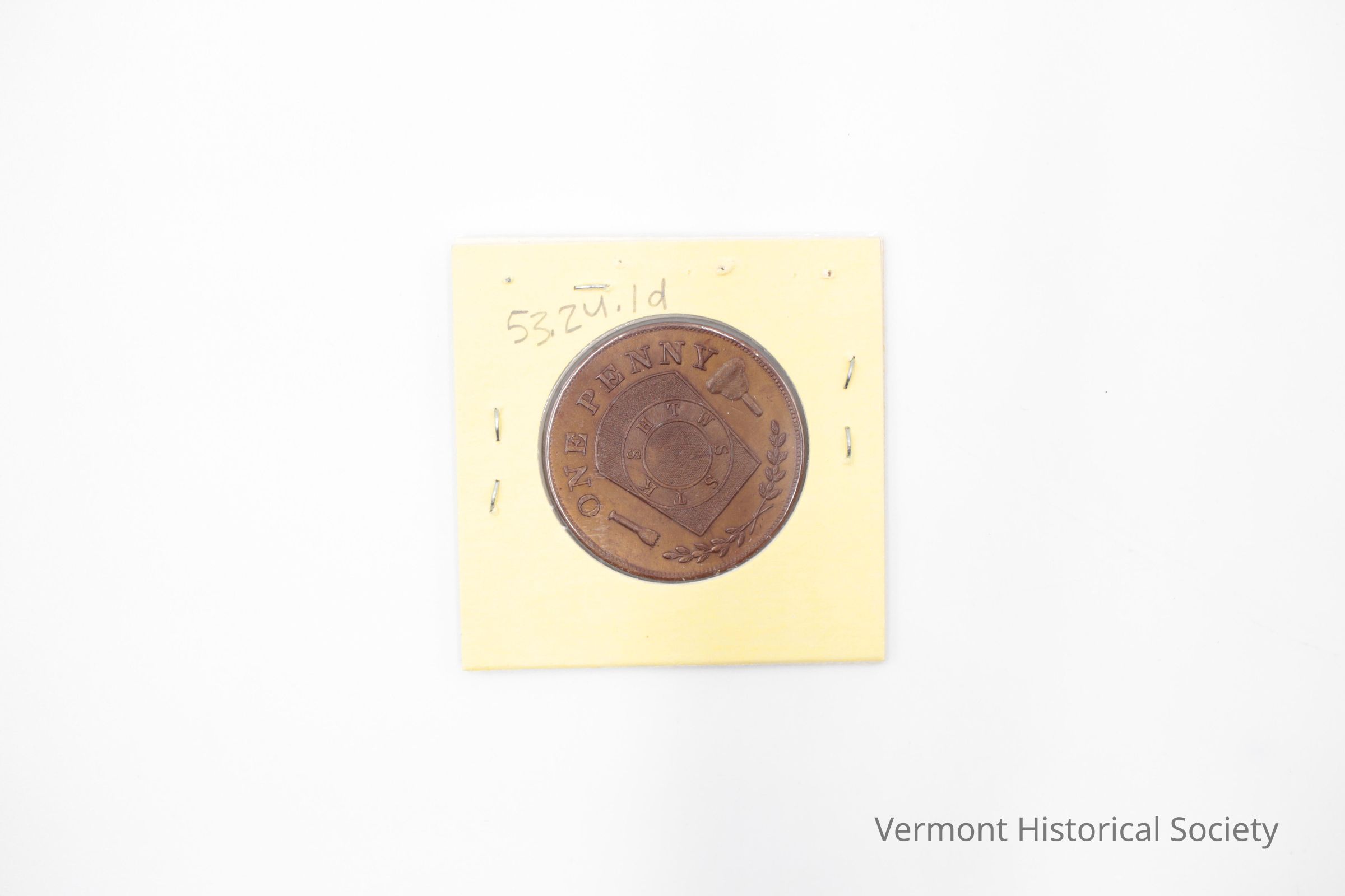 Copper token with the words "ONE PENNY" on the obverse with an olive branch at the bottom, a tablet with a circle of initials "H T W S S T K S" in the center, a chisel, and a funnel. On the other side of the token are the words, "Cleveland Chapter No. 20 R.A.M. Newport, Vt.”Use