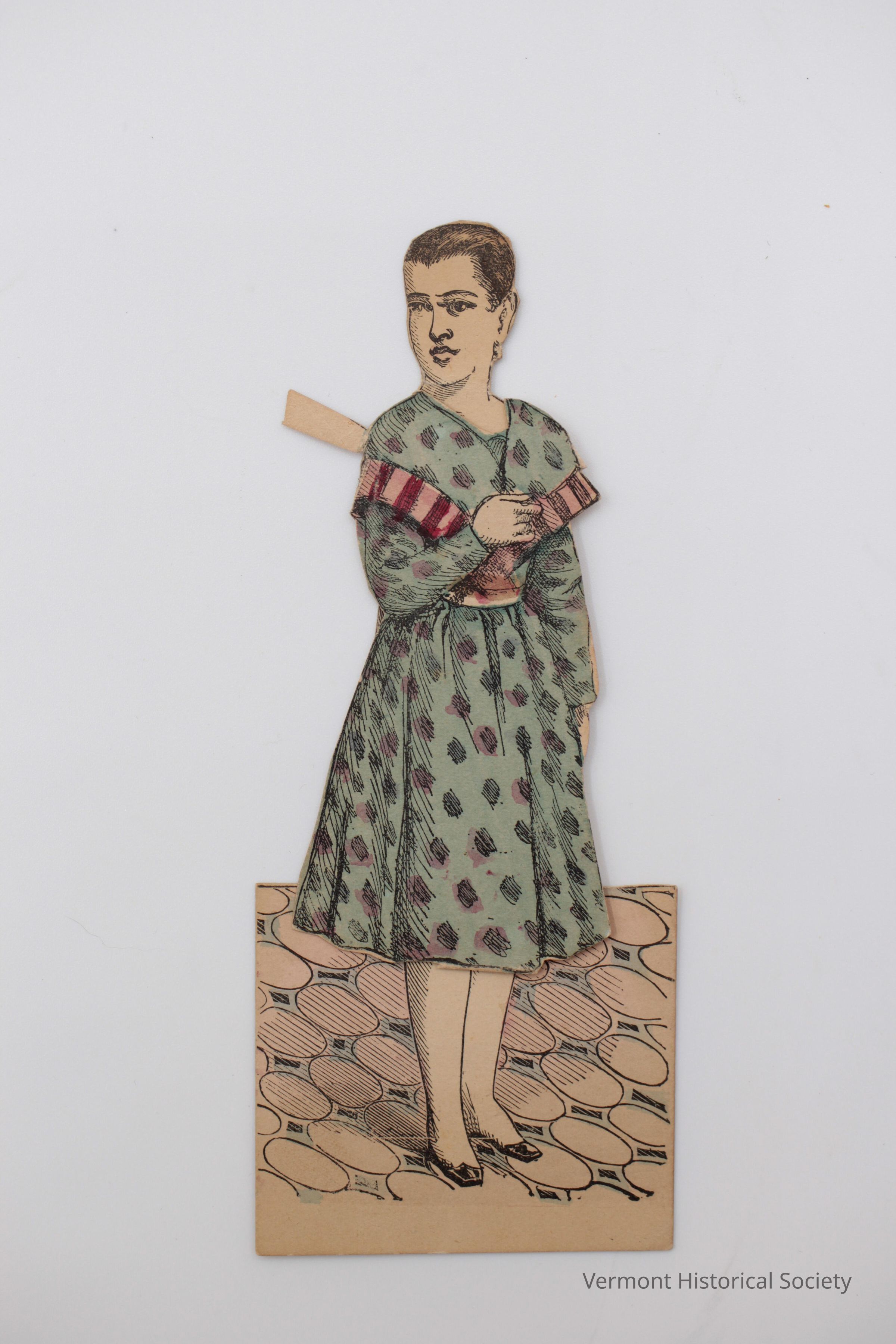 Paper doll dress. The dress is blue with pink spots and pink fringe on the shawl bodice.