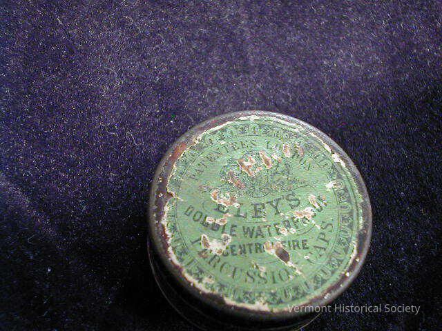 Small, round tin box. A sticker on the top of the lid reads, "PATENTEES LONDON / ELEY'S DOUBLE WATERPROOF CENTRAL FIRE PERCUSSION CAPS". The tin is filled with small percussion caps, similar in appearance to thimbles.Context