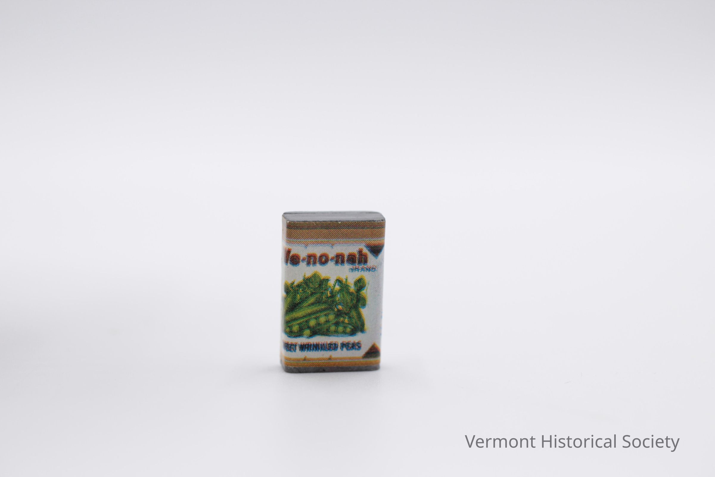 Miniature rectangular food-storage can. The can is made of silver-colored plastic wrapped with a paper label. One side of the label shows a group of split pea pods and vines with the words, "We-no-nah [illeg] PEAS". The other side shows a stereotypical image of an indigenous American woman. She is wearing her hair in two braids with a feathered headdress.Context