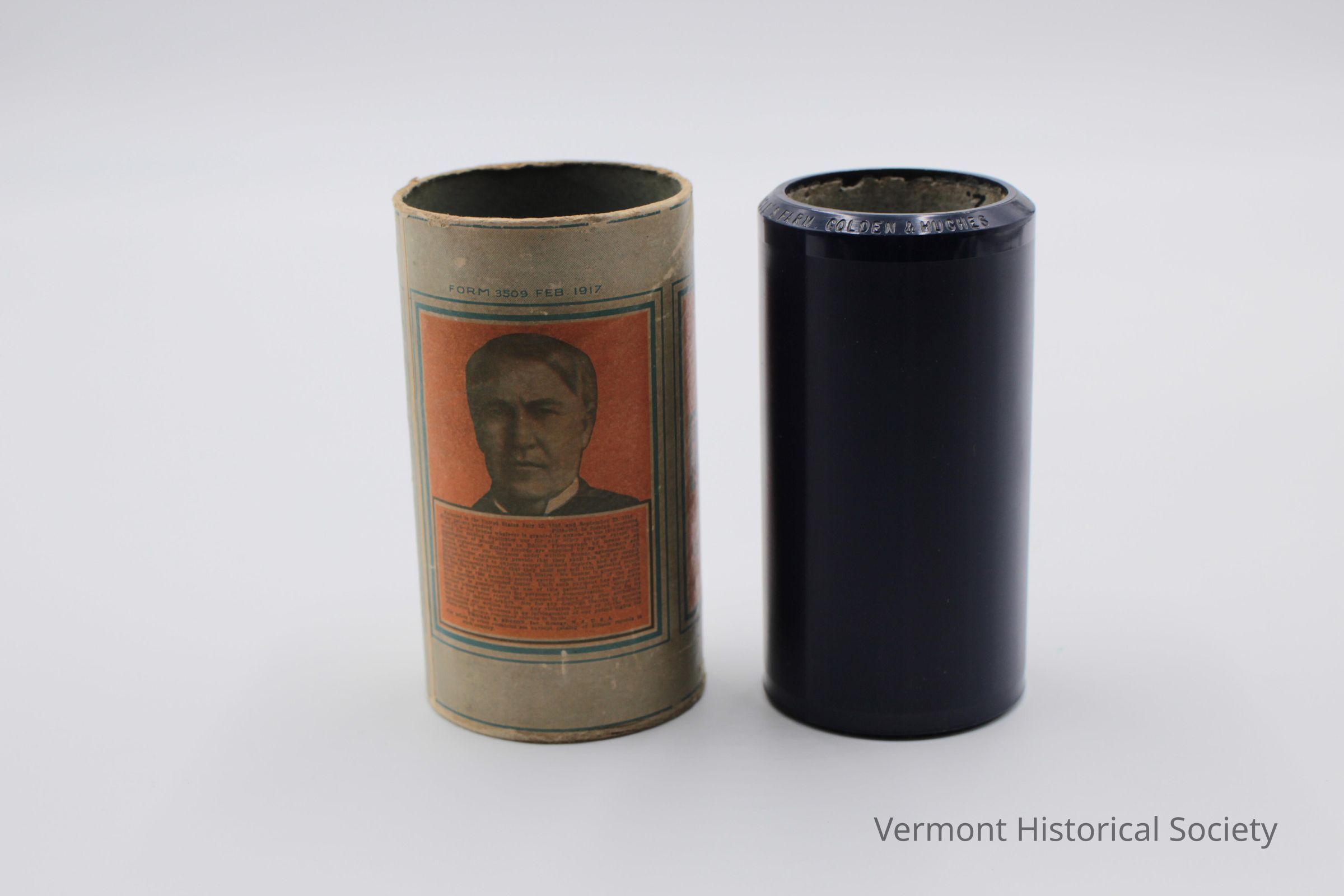 The cylinder is accompanied by a cardboard case with a top lid. The case is labeled on one side with the words, "EDISON BLUE AMBEROL RECORD", in blue on an orange ground. The other side is printed with a photographic portrait of Thomas Edison above the patent and trademark information and the price (60 cents). The lid is labeled, "1511 - MY UNCLE'S FARM / VAUDEVILLE SKETCH / GOLDEN AND HUGHES / EDISON BLUE AMBEROL RECORD".Use