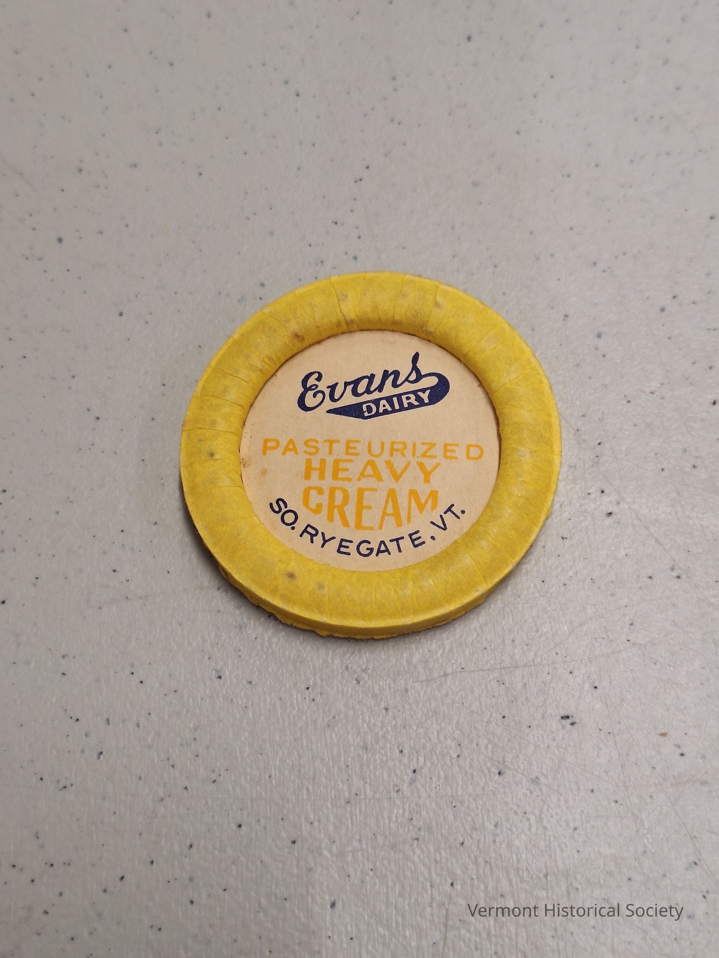 Yellow waxed cardboard cap for cream. In the center of the cap is the following: "Evans Dairy, pasteurized heavy cream, So. Ryegate, VT."Context