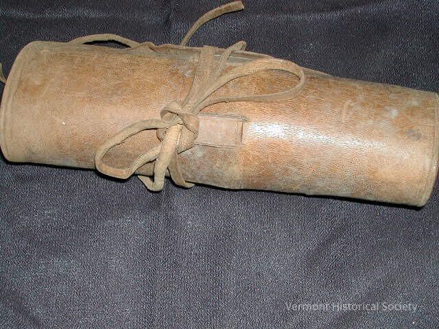 Two rolled files or bill carriers. Each file consists of a long, narrow piece of leather with folds at the top and bottom. They are each slit periodically across the center to hold a tie use to keep them rolled. One roll is marked, "C Rockwell Cornwall Vt". The other roll was filled with bills upon receipt, transferred to the archive.