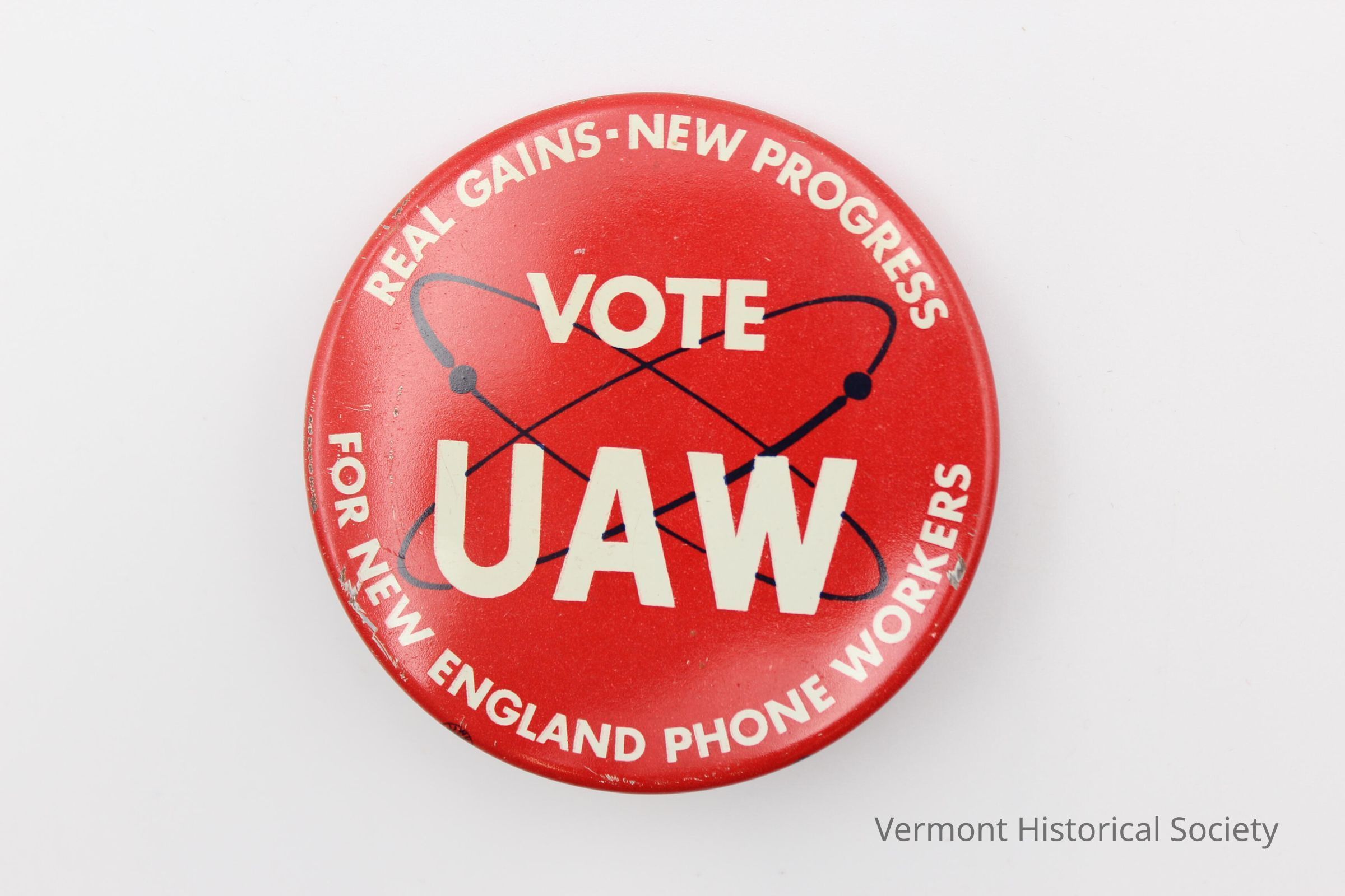 Round metal pin with white words over a red ground. The words, "REAL GAINS-NEW PROGRESS/FOR NEW ENGLAND PHONE WORKERS" circles the edge and "VOTE UAW" is in the center over an illustration of two orbits in black.