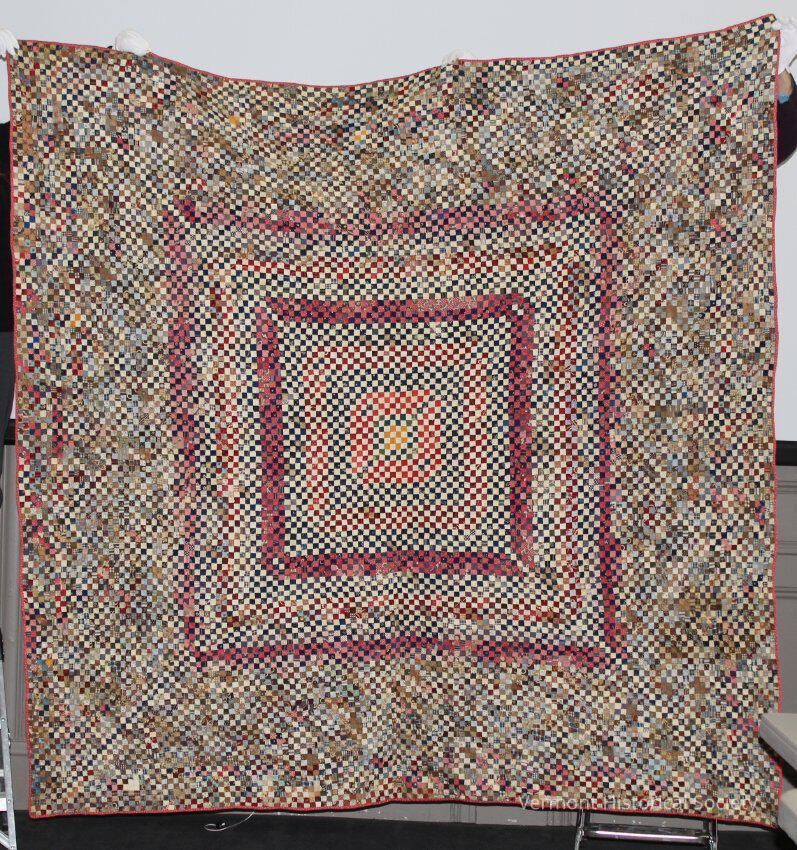 Pieced "postage stamp" quilt. All the pieces of the quilt face are square, and the colors are arranged to hint at a log cabin pattern with a small, central square (yellow) surrounded by ever larger squares (red). There are no solid fabrics used. Pieces included woven patterns, largely plaids with some stripes, and printed calicos in floral patterns. The quilt in backed in red calico printed with a small pattern of a crossed hammer and axe. The edges are bounded in pink-and-red floral calico. There are 17,820 pieces on the front (per donor).Context