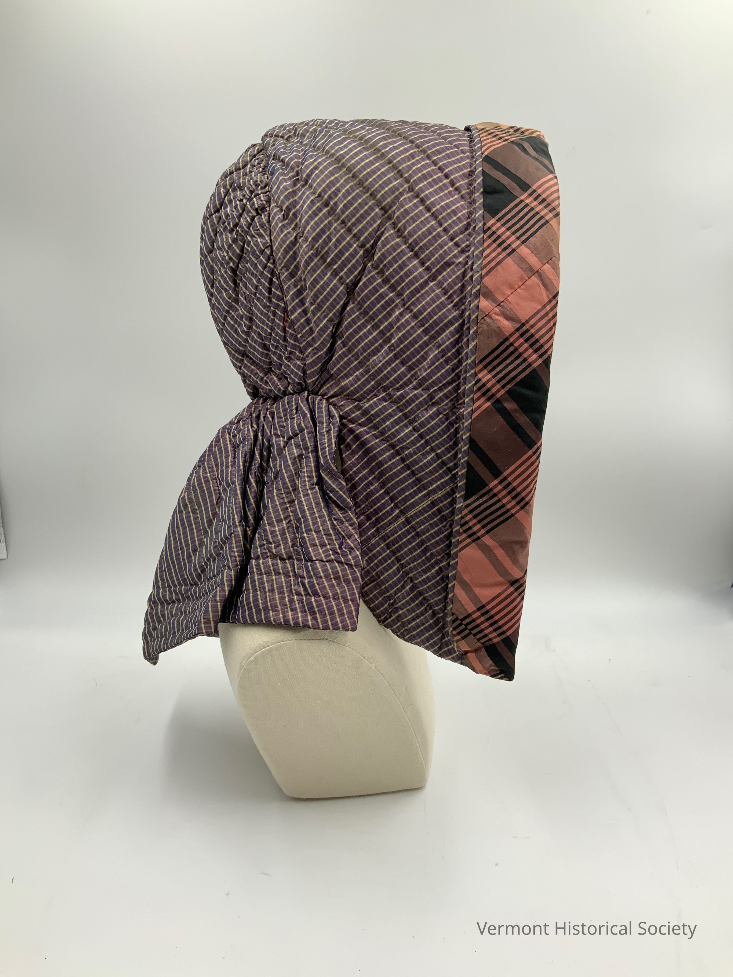This is a quilted winter bonnet or hood, which features an exterior fabric that is purple with a subtle white windowpane pattern. The lining of the bonnet is a bold pink-and-black large-scale plaid. The brim of the bonnet extends at the bottom, reaching past the wearer's shoulders, and the tail is also long. Both the brim and crown of the bonnet are quilted with diagonal channels. The tail is quilted only along the hem in four horizontal channels, which adds structure to the tail. The lining is not quilted. The front edge of the brim is turned back and tacked in place. Finally, there are black ribbons that tie under the chin.