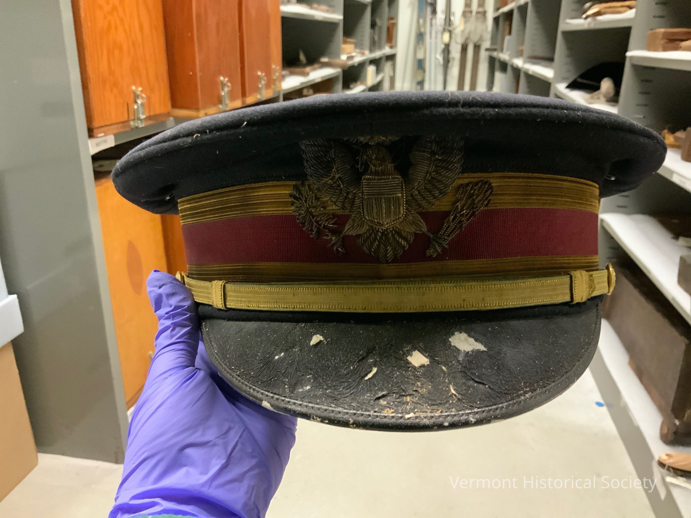 This service cap is designed with a wide, soft crown that is set at an angle and positioned higher in the front than in the back. A ribbon with stripes of gold and red, with the red stripe in the center, is wrapped around the base of the crown. The front of the cap features a stiff, round brim with a faux patent leather finish, which appears to have been damaged. A gold strap runs across the top of the brim and is attached to two brass buttons. The center front of the cap is adorned with a large emblem in the form of a Federal eagle, which has been crafted using goldwork embroidery.
