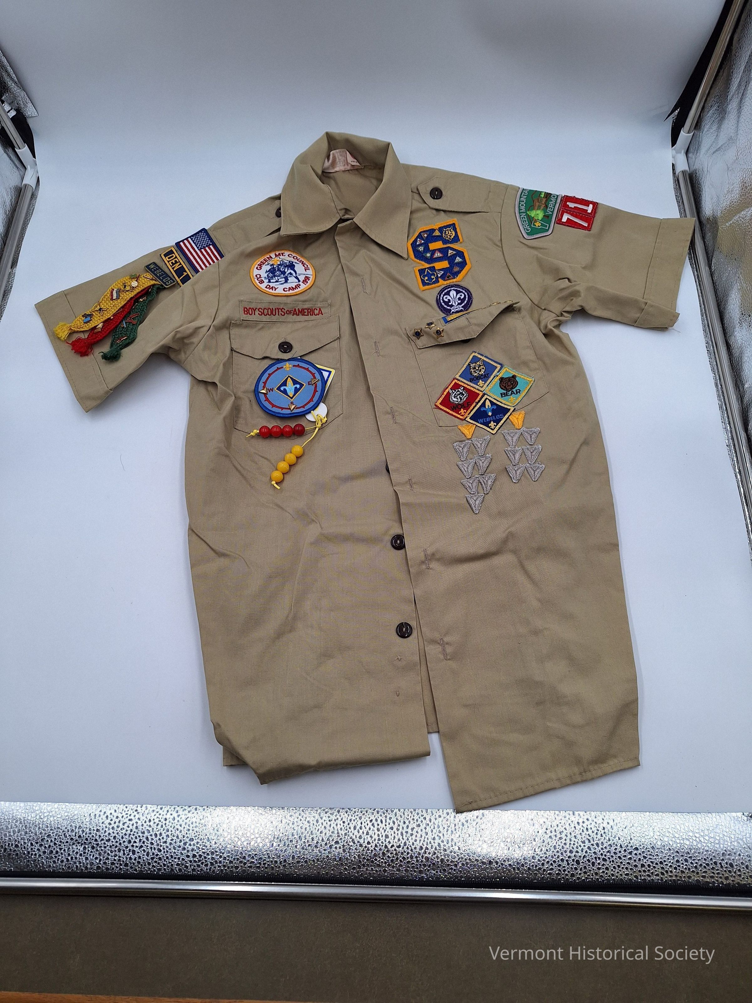 Khaki Cub Scouts uniform shirt. The shirt has a variety of iron-on patches and pins indicating awards and badges earned. Worn by Kenny Lindner while part of the Waterbury Cub Scout Pack 711.