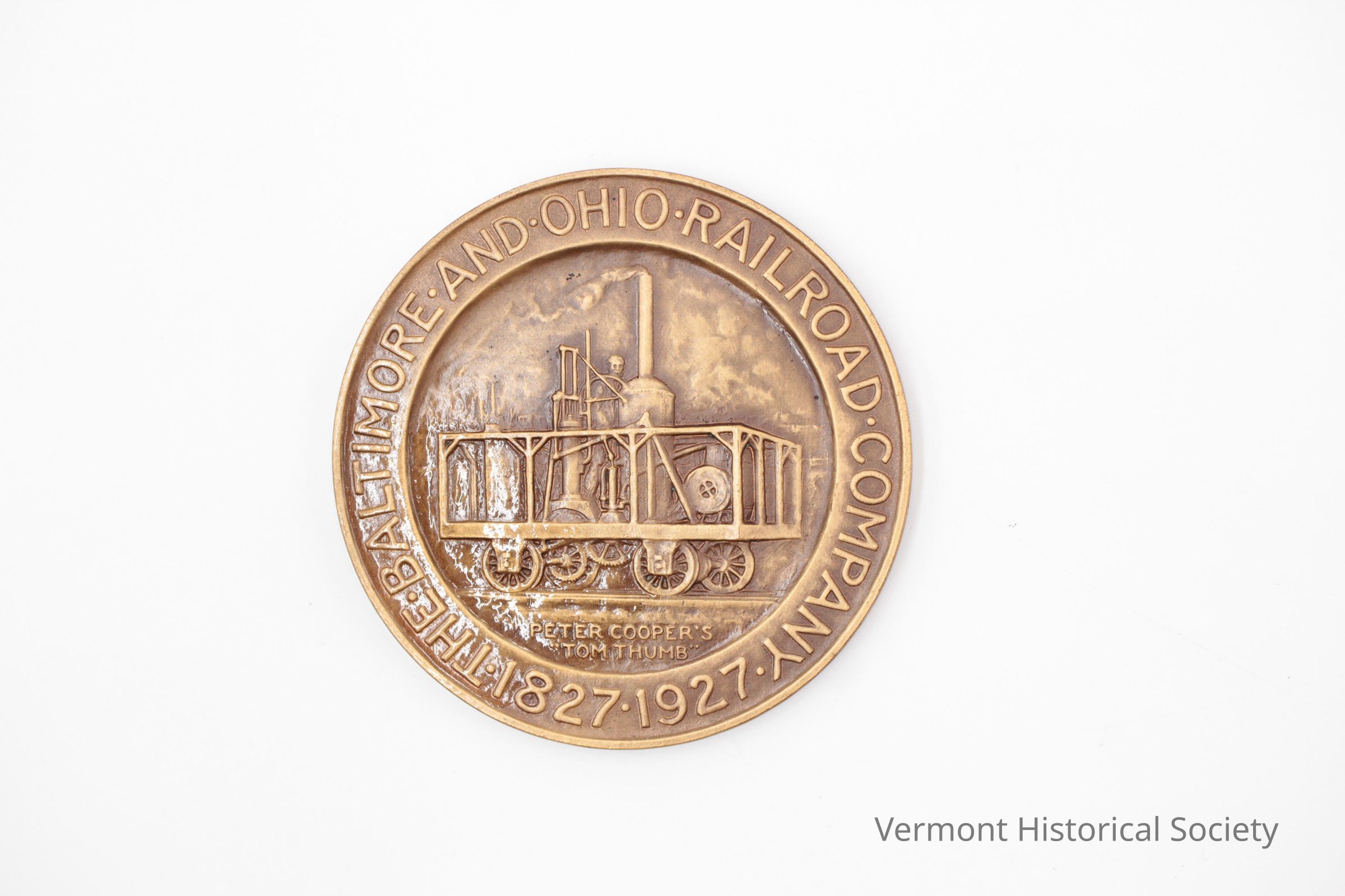 Commemorative medal with an image of a small steam-powered wagon labeled "PETER COOPER'S "TOM THUMB"" on one side. The inscription, "THE BALTIMORE AND OHIO RAILROAD COMPANY 1827 1927", rings the edge. The other side shows a steam-powered passenger train with a naked man flying beside it, reaching out to ring the train's bell. The inscription, "ONE HUNDRED YEARS / SAFETY STRENGTH SPEED" rings the edge.Context