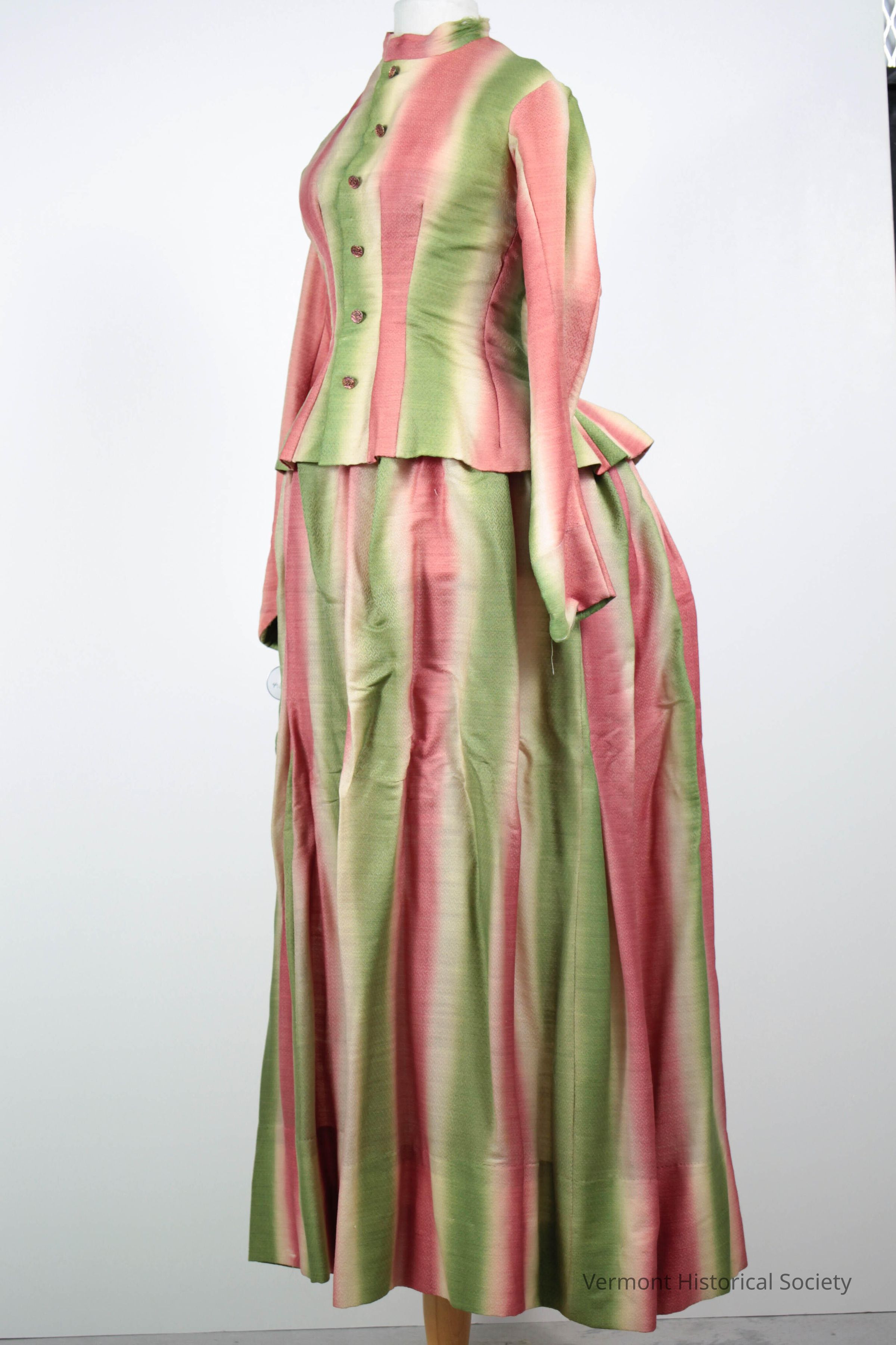 Two-piece dress consisting of a bodice and skirt. The bodice has long, curved sleeves and opens up the center front. There are 6 buttons, but no buttons holes. There is a strap around the waist interior that fastens in the center front with hooks and eyes. The skirt is gathered to a cotton waist band, and opens in the center back with extra fabric to accommodate a bustle. The fabric is a very light wool in vertical ombré stripes of green, cream, and pink. Both the bodice and skirt are unlined.Context