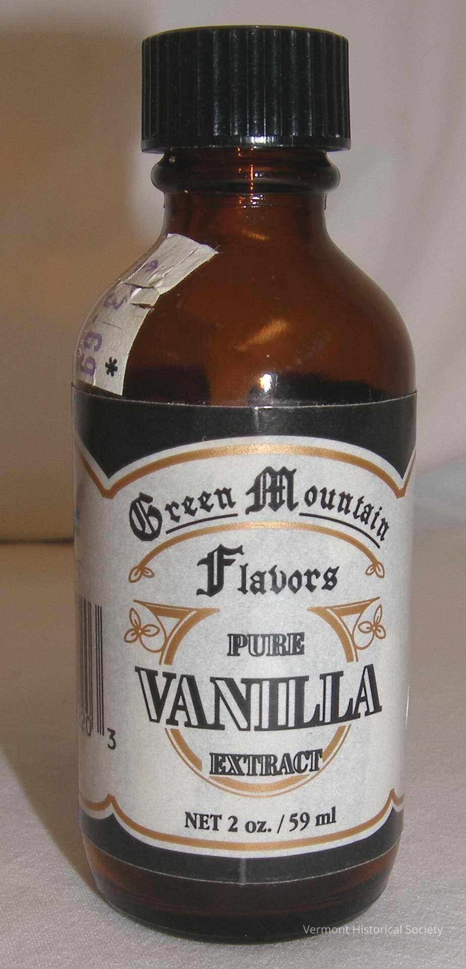 Small brown bottle with black screw top. Label is off white with black lettering and golden brown details. It reads in part: "Green Mountain/Flavors/PURE/ VANILLA/ EXTRACT/ NET 2 oz./59ml" and at the side: "Within the Green Mountains of Vermont, we have created the finest all natural gourmet flavors available....Green Mountain Flavors/ Chester, VT 05143" and "INGREDIENTS: Vermont Spring Water, Grain Alcohol (37%), Vegetable Glycerine, Vanilla Bean Extractives..."