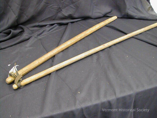 Wooden flail consisting of two round wooden dowel that taper slightly toward one end. The wider ends are connected with a buckled leather strap.