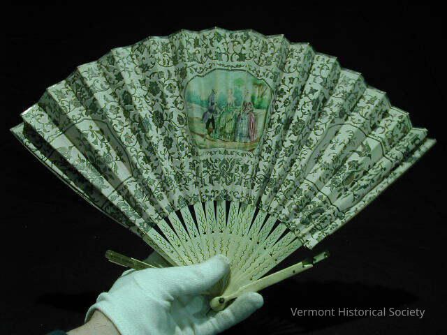 Hand fan consisting of pierced ivory ribs with a paper leaf. The leaf is printed with a central design of three rococo figures in a garden within a rectangular frame. It is flanked by two rectangular segments printed in gold with flowers and a bird. The cartouches are surrounded by a design of floral vines printed in gold.