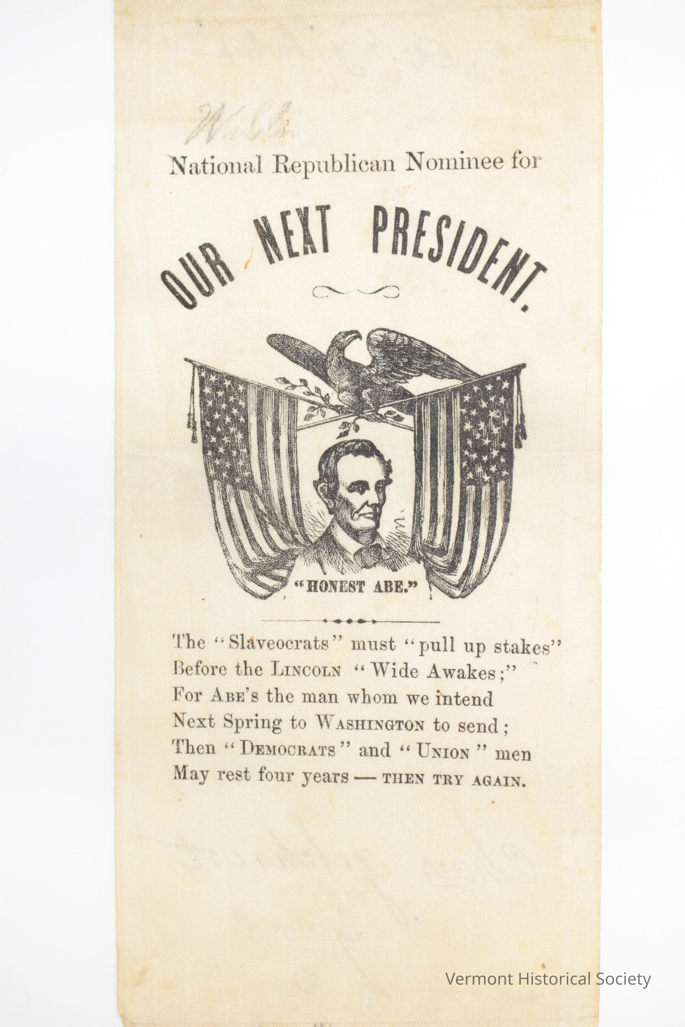 White satin-woven silk ribbon printed in black with a bust of Abraham Lincoln between two American flags with an eagle. The image is labeled "HONEST ABE." Above the image is the inscription, "National Republican Nominee for OUR NEXT PRESIDENT." Below the image is a poem that reads, "The "Slaveocrats" must "pull up stakes" / Before the LINCOLN "Wide Awakes;" / For ABE'S the man whom we intend / Next Spring to WASHINGTON to send ; / Then "DEMOCRATS" and "UNION" men / May rest four years--THEN TRY AGAIN." The name "William" is handwritten in pencil at the top of the ribbon. The name "Cas gilchrist" is written on the reverse.Context
