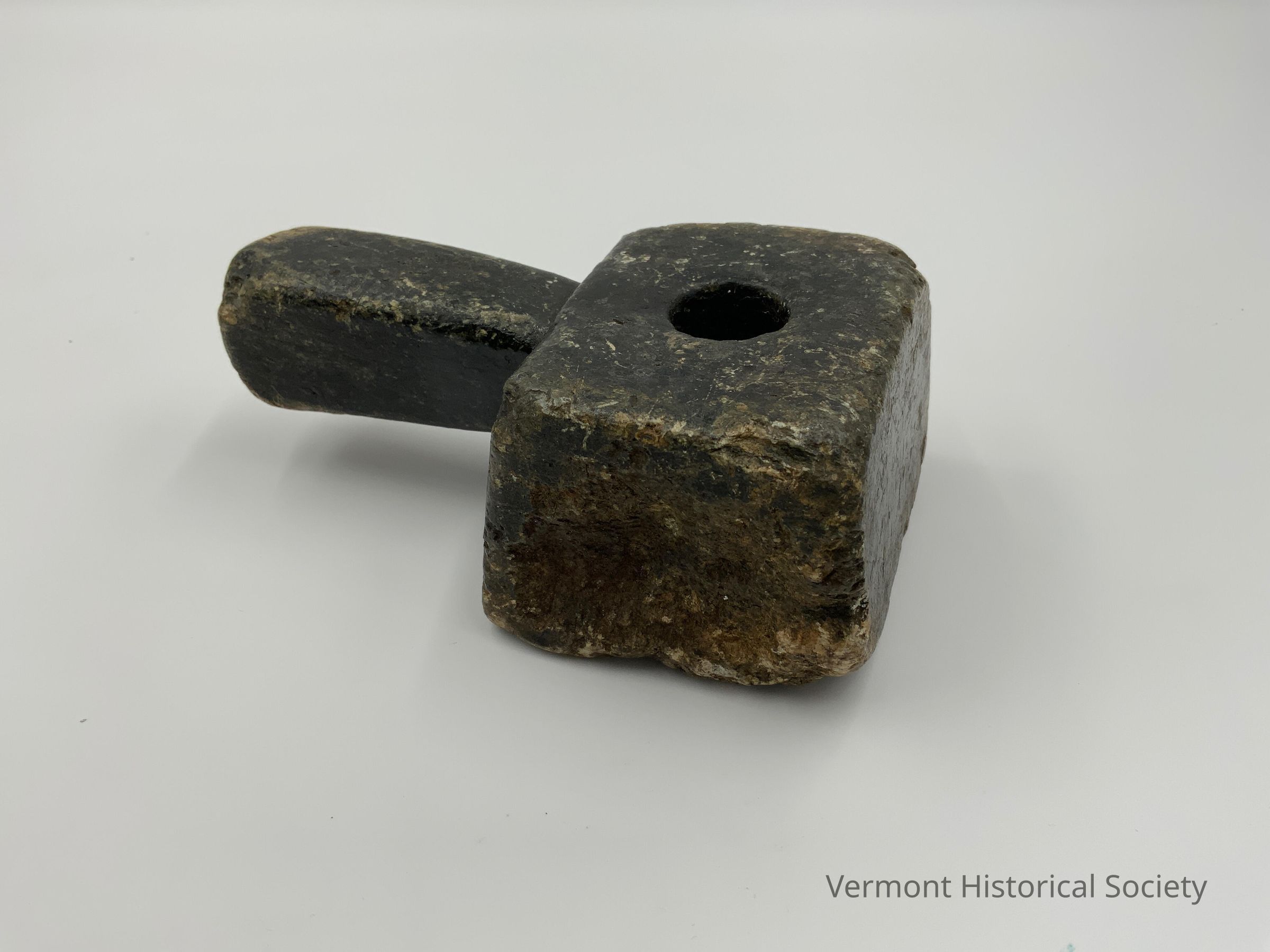 Candlestick carved from a single piece of soapstone. It consists of a circular hole within a rectangular base, with a handle protruding from one side of the base.