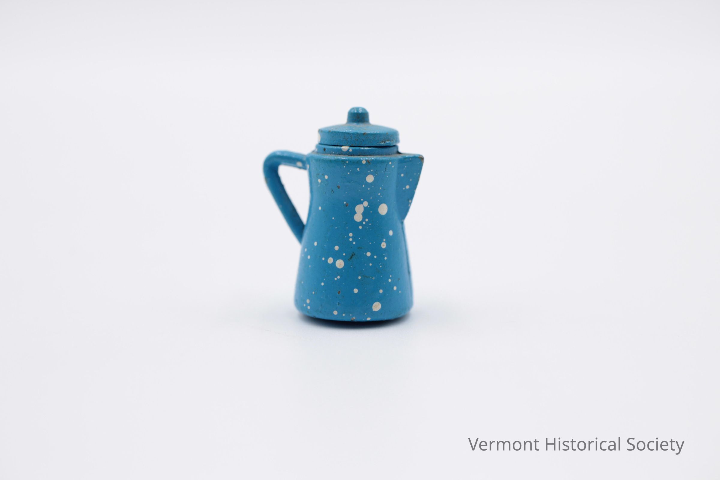 Miniature blue enamel coffee pot with removable lid. The pot is speckled with black and white.Context