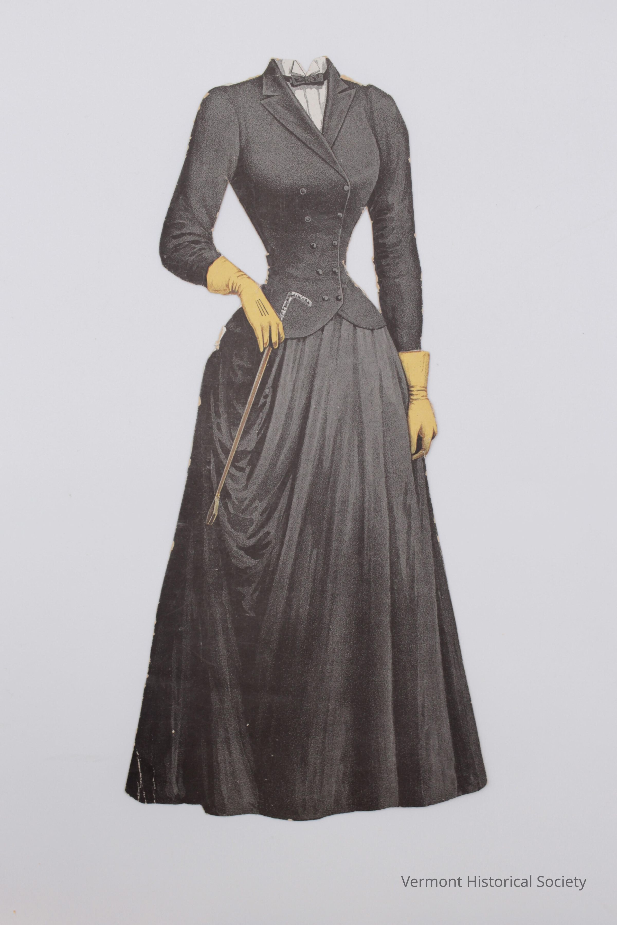 Black riding habit for a paper doll. The bodice is styled like a double-breasted men's suit jacket, with a white shirt front and bowtie at the neck. The sleeves are long and tightly fitted, and the hands are covered with yellow gloves. The sidesaddle skirt is draped up on the left, and one hand is holder a riding crop.