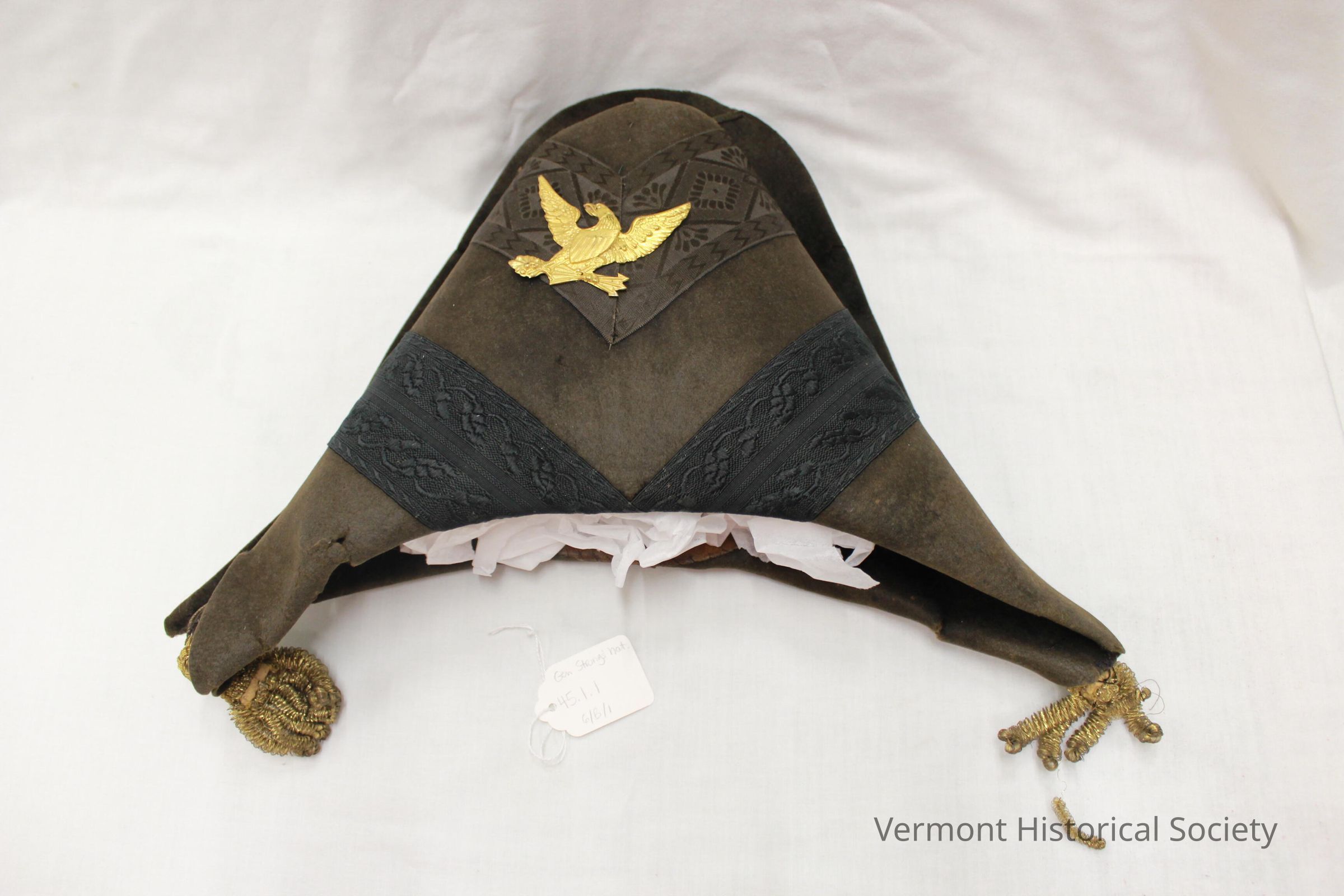 Bicorn hat with a tall center peak. The front of the hat is decorated with two chevrons of black figured silk ribbon. There is a brass eagle pin at the center of the upper chevron. The back has a large X stitched at the center with black ribbon. The side points are decorated with large, gold tassels. The interior is lined with white satin-woven silk and stamped with the mark, "C. ST. JOHN 118 BROAD WAY NEW YORK."Context