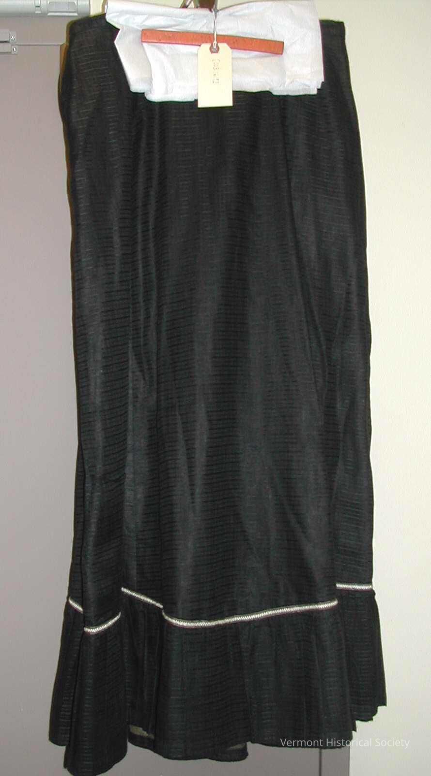 Long black skirt of windowpane cotton pattern with glazed olive green lining, white & black trim above 12.5-in. bottom ruffle, short fringed decorative braid at bottom of hem. Five eyes spaced around waistband suggests attachment to bodice, which is missing.Use