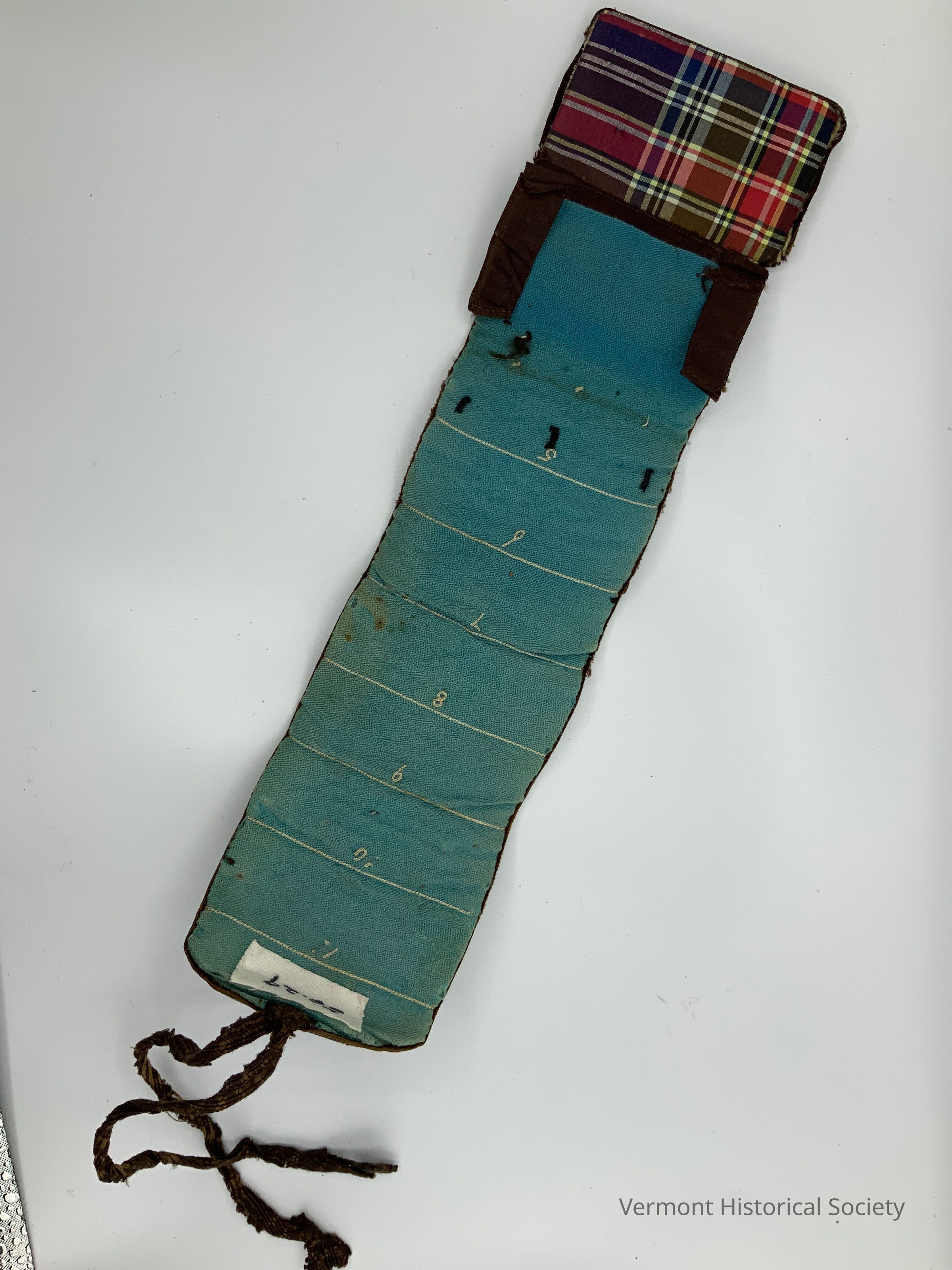 Fold-up needlecase. The exterior of the case is brown leather. It unfolds to reveal a long panel of blue silk embroidered in white thread with horizontal dividing lines, each labeled with a number from 5 to 11. The final piece is covered with red, green, yellow, and blue plaid.