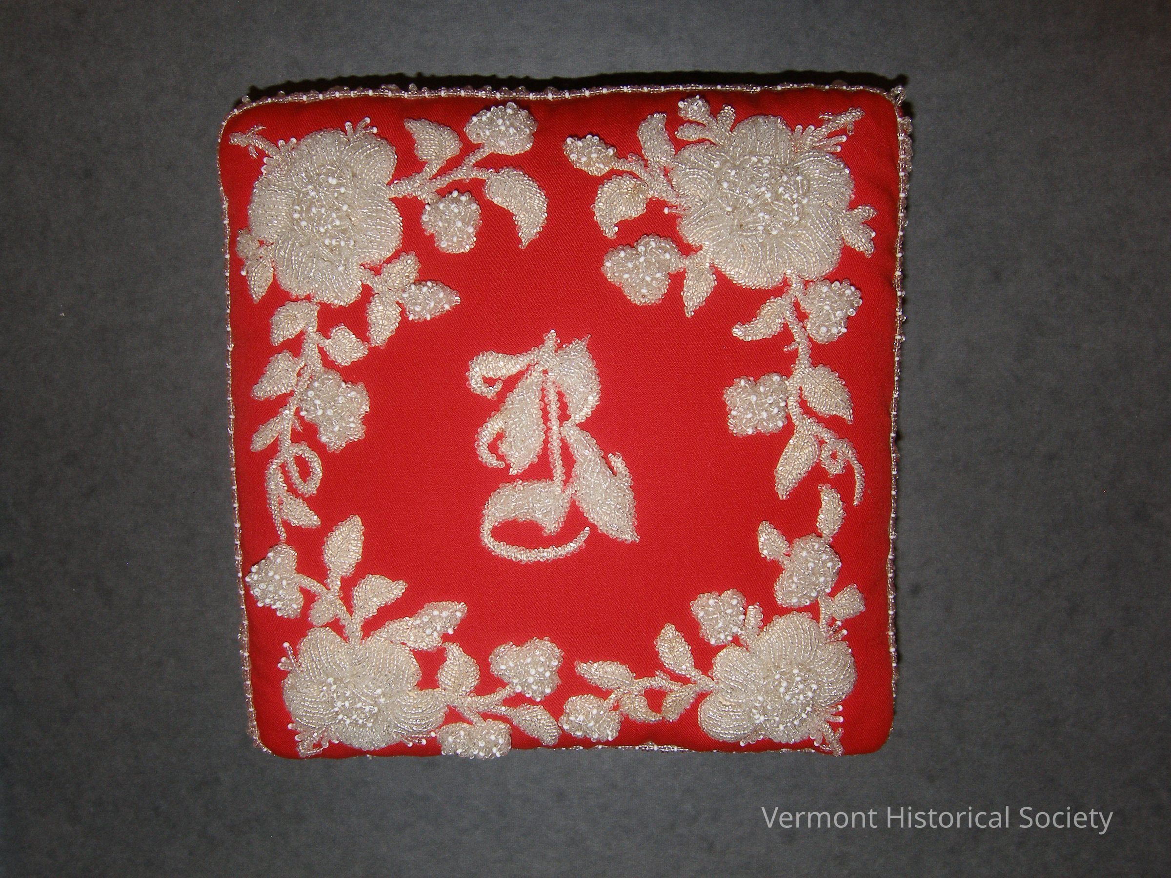 Pincushion covered in red, twill-woven wool. The top is decorated with clear glass beads couched onto paper then appliqued onto the wool. The beads for a floral frame around the edge of the cushion and the letter R in gothic scripts at the center. There is white, beaded fringe around the edge. A paper note is stitched onto the bottom that reads, "Beaded pillow, made for Miss Clara Ranney's aunt, by a Vermont Indian woman (possibly an Abenequi), while in Brattleboro, about 1885. Gift of Miss Clara E. Ranney, Saxton's River, Vt. 8/12/50".Context