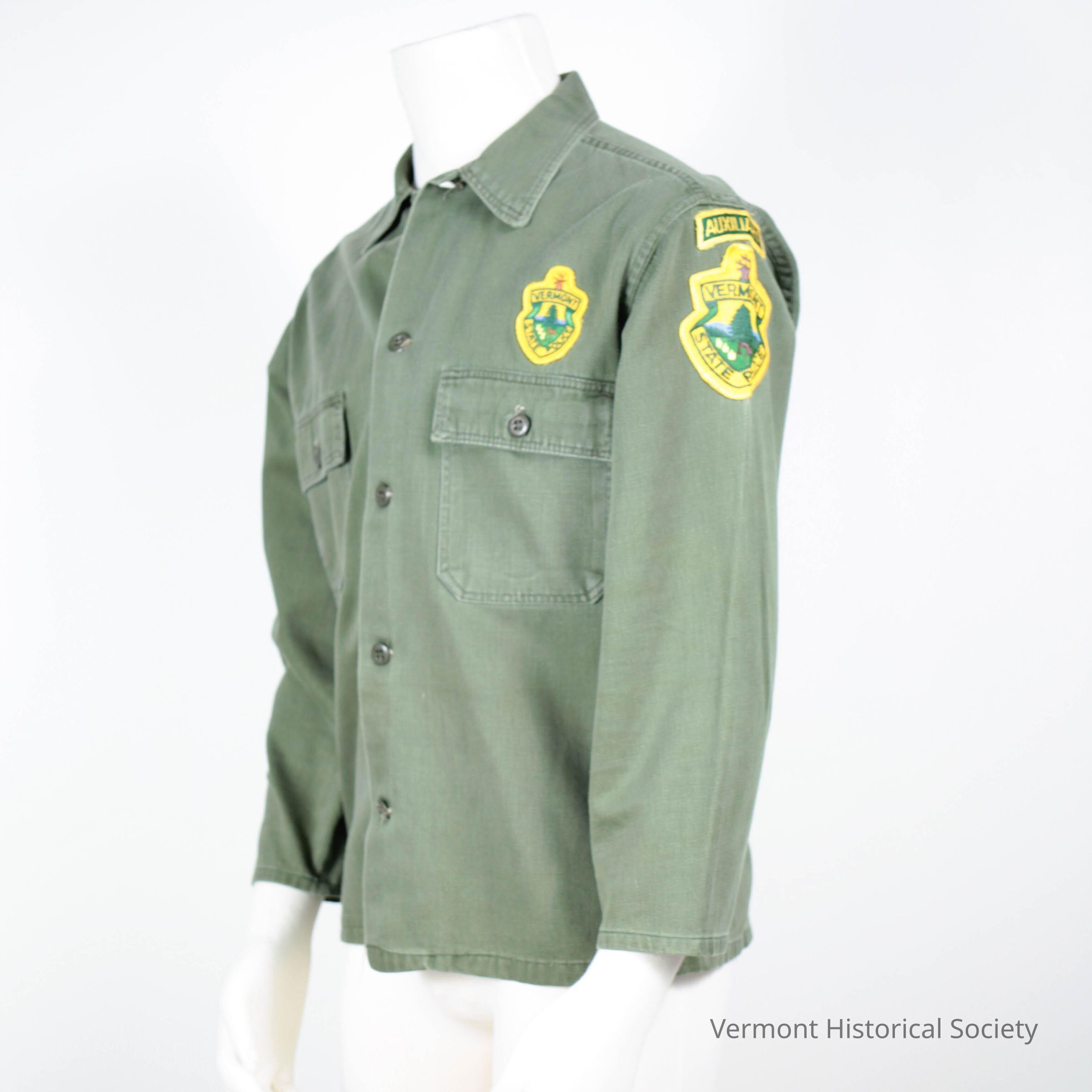 Olive green twill-woven cotton-blend long-sleeved shirt. The shirt secures up the center front with five green plastic buttons. There are two patch pockets at the breast that secure with top flaps and green plastic buttons. There is a patch above the left pocket with the Vermont state seal with the inscription, "VERMONT STATE POLICE". Each sleeve has two patches: a curved green and yellow bar that reads, "AUXILIARY", and the Vermont state seal with the inscription, "VERMONT STATE POLICE".