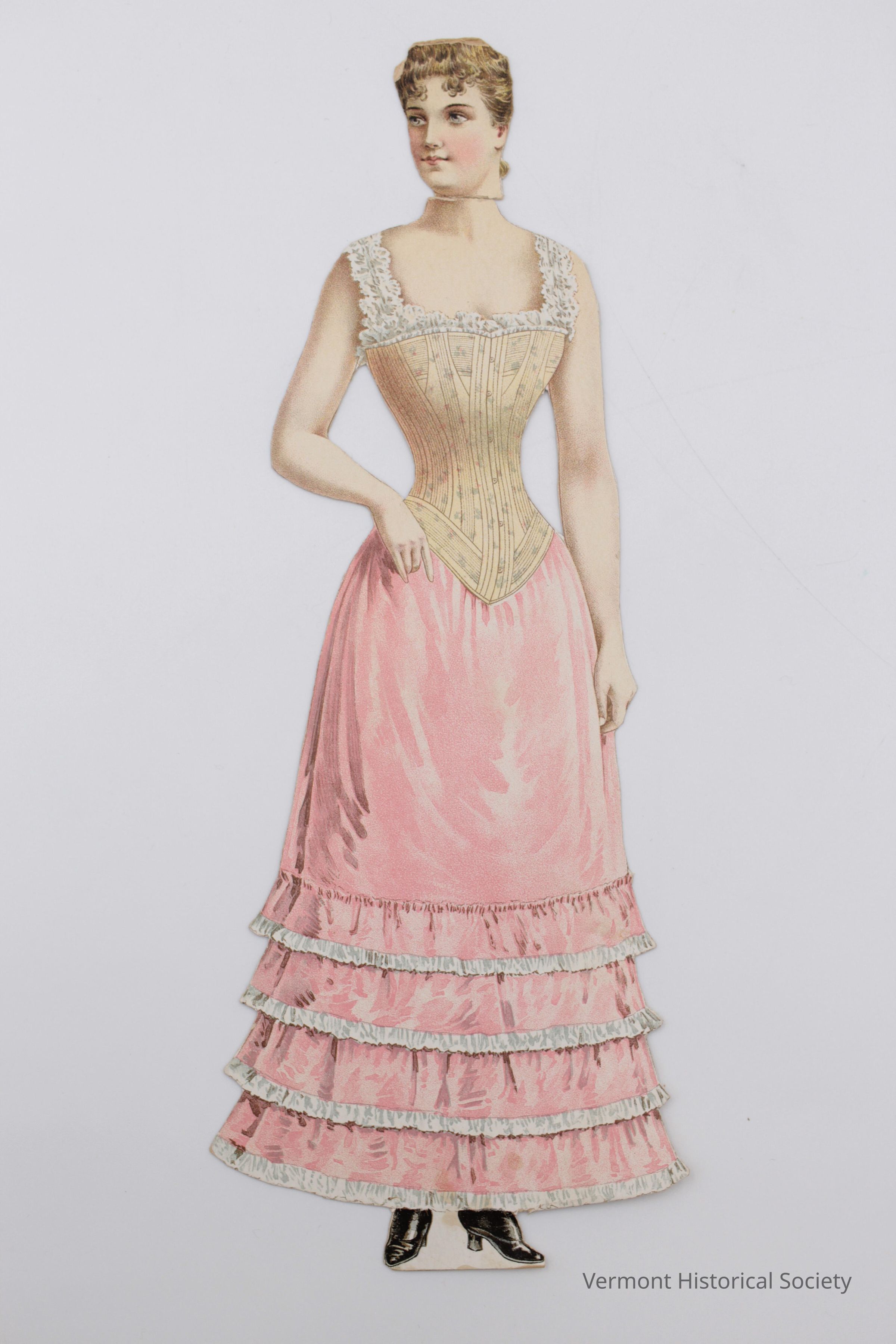 Paper doll made of cardstock showing a woman in a corset and petticoat. The corset is cream colored with small sprigs of flowers. Lace straps of a camisole are at the shoulders. The petticoat is pink with four flounces along the hem. Black shoes peek out the bottom. The head (detached) faces to the doll's right and has brown hair. The back of the doll is printed with the inscription, "THE BOSTON SUNDAY HERALD / Will issue, each Sunday, a Fashion Plate Supplement which will be in the very latest style and when cut out will exactly fit on this figure. Order the BOSTON SUNDAY HERALD AT ONCE."Context