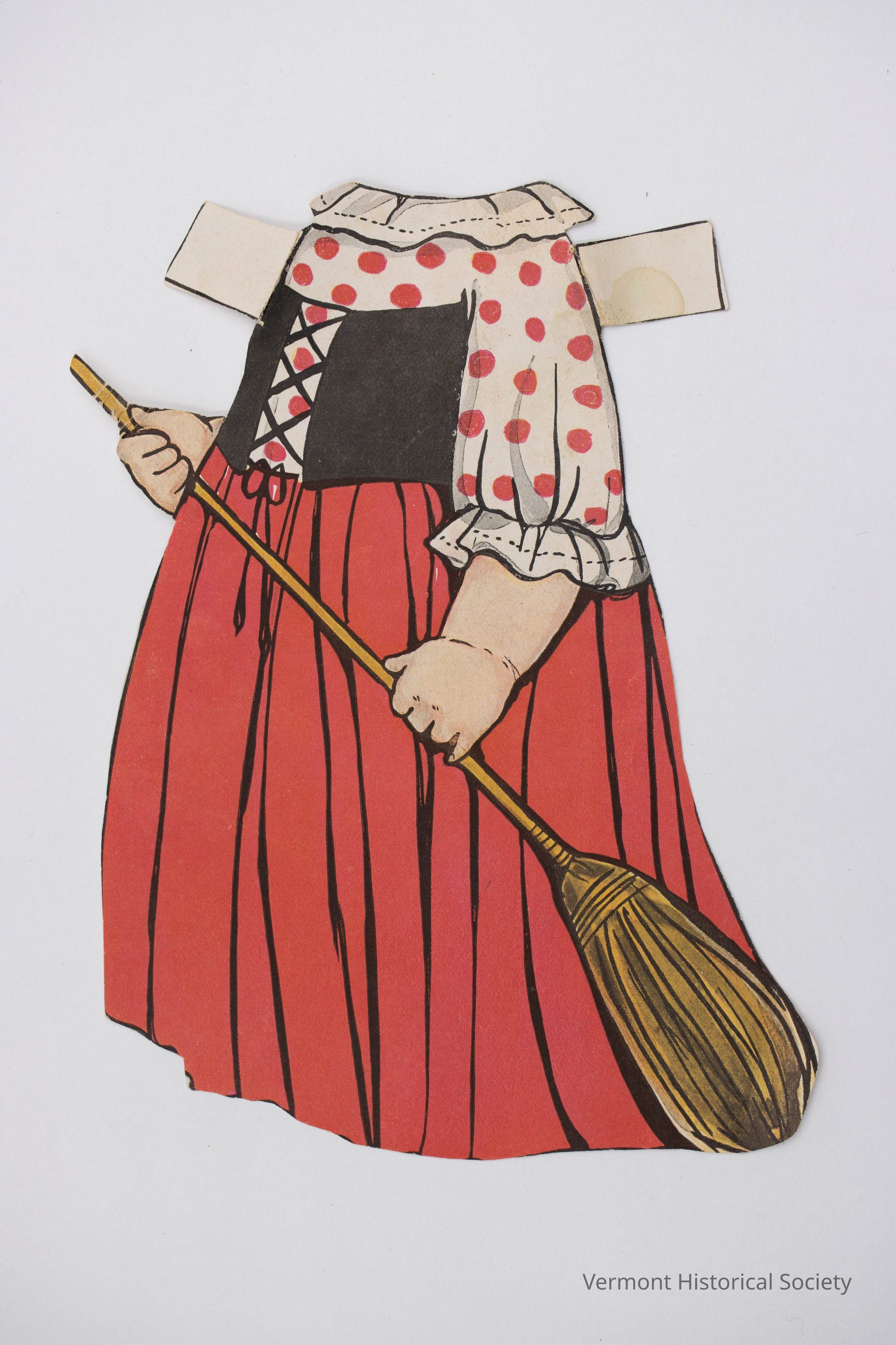 Printed paper dress for a paper doll. The dress has a black bodice over a white shirt, and a red skirt. The hands are holding a broom. The back shows a portion of a sales catalog page.Context