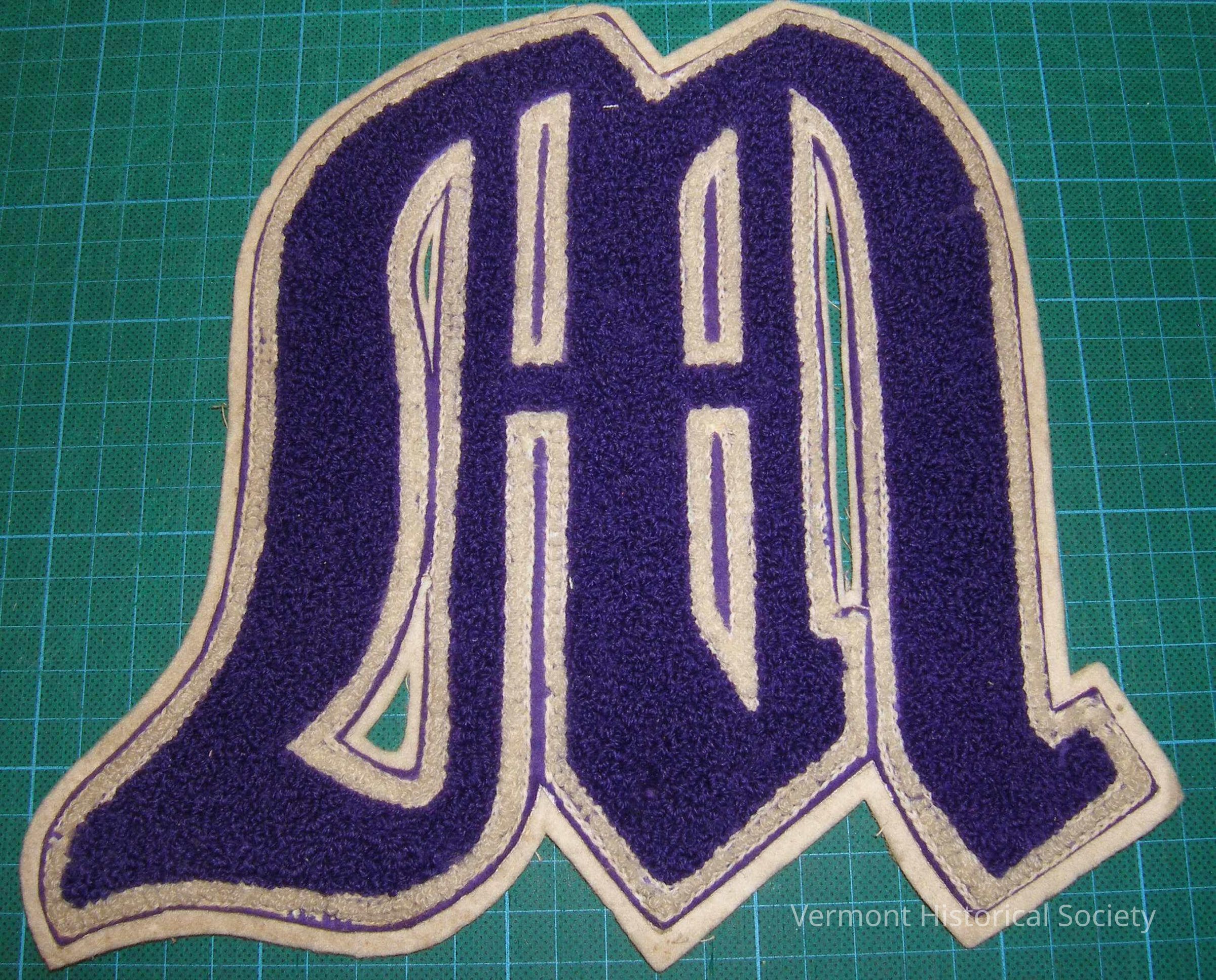 Purple and white varsity letter with looped pile. The letter is in the shape of an M in gothic font. The patch is backed with plain-woven cotton.