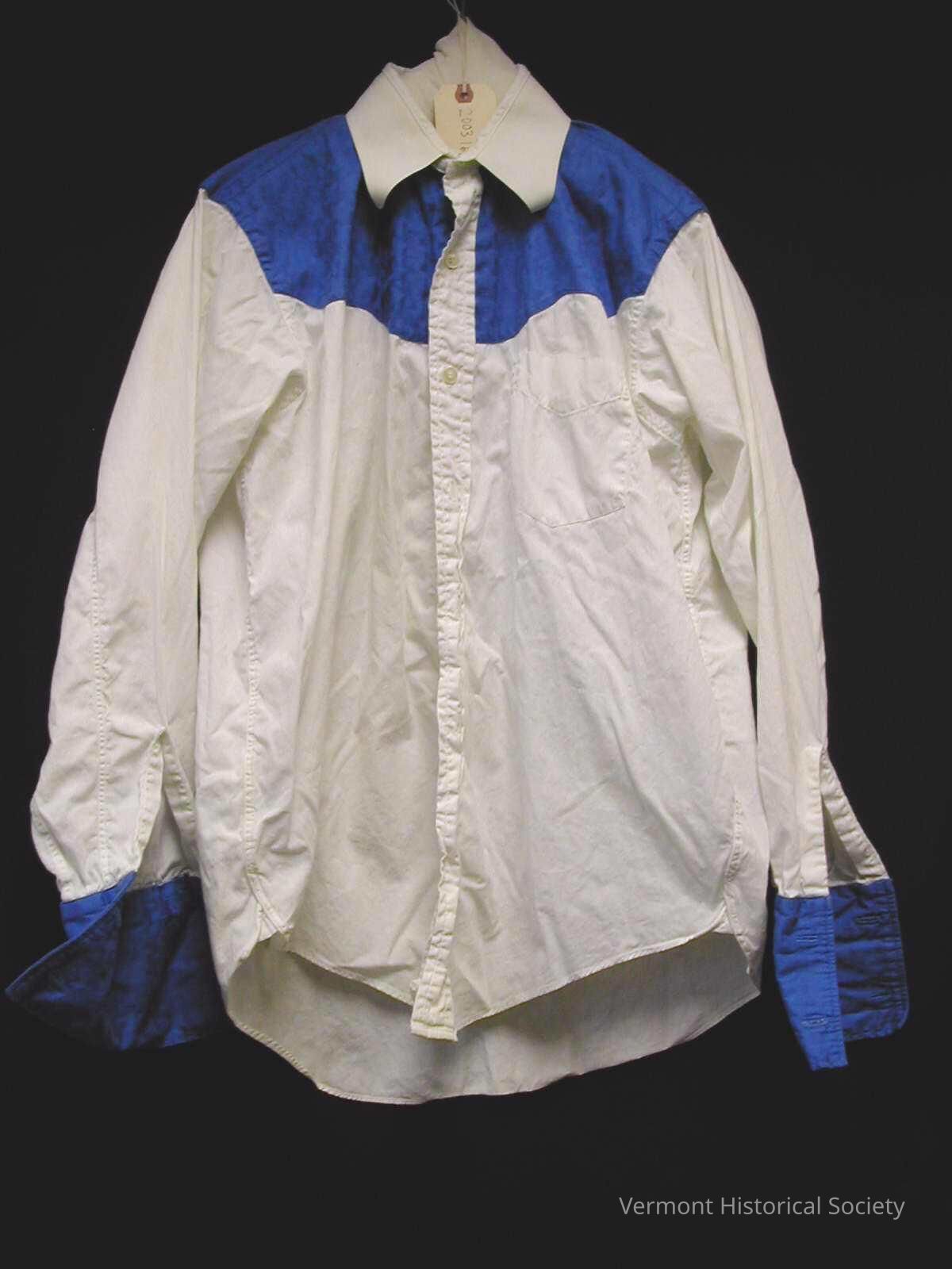 White long-sleeved shirt with blue yolk. The shirt secures up the center front with white buttons, and there is a breast pocket on the proper left.