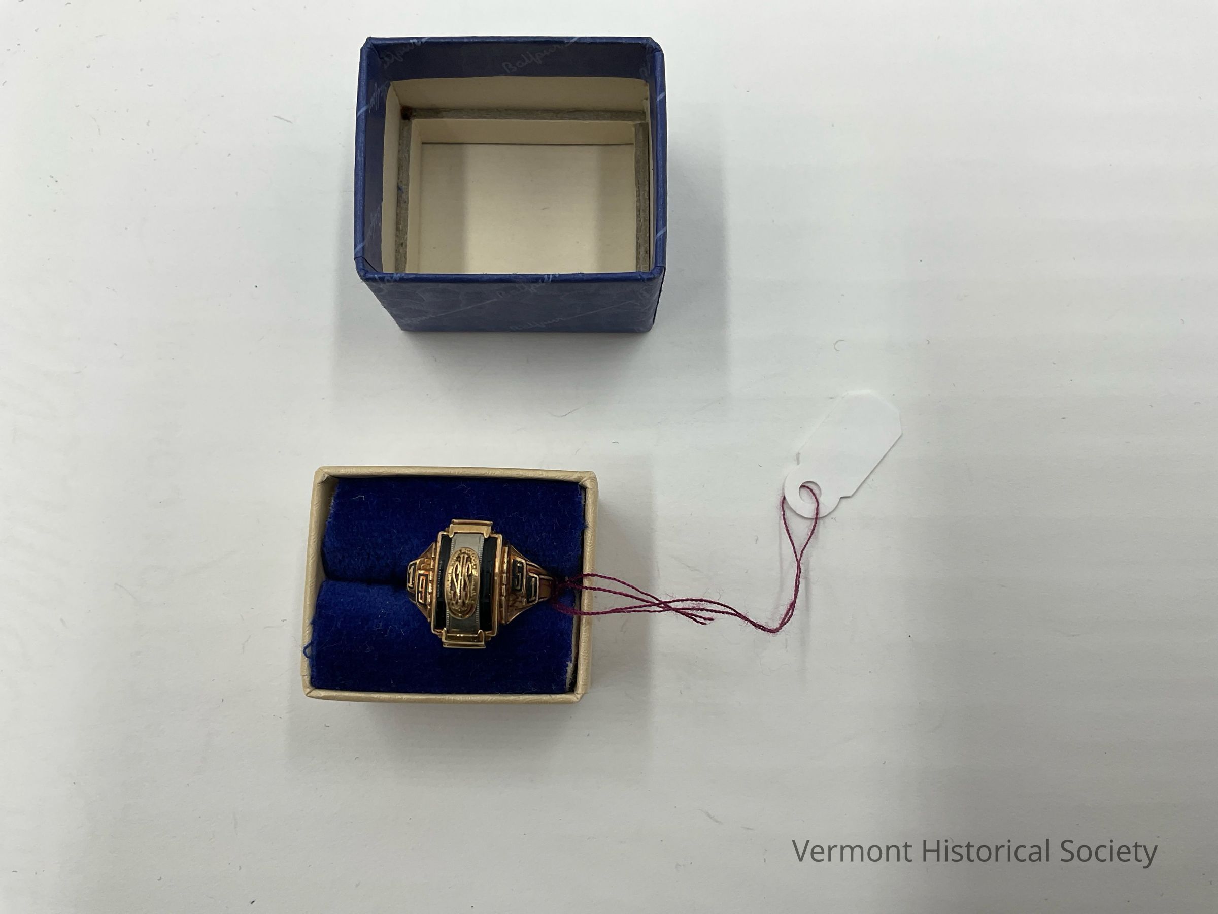 Large class ring with onyx inlay (a). The center has an oval with the initials SHS surrounded by the words, "SPAULDING HIGH SCHOOL". The center portion is flanked by the numbers 19 and 51. The initials CBC are engraved inside the band. The ring resides inside a white cardboard box (b) with a blue velvet insert to hold the ring. The cardboard lid (c) is wrapped in dark blue paper printed with "Balfour" in white script with white stripes diagonally across the surface.