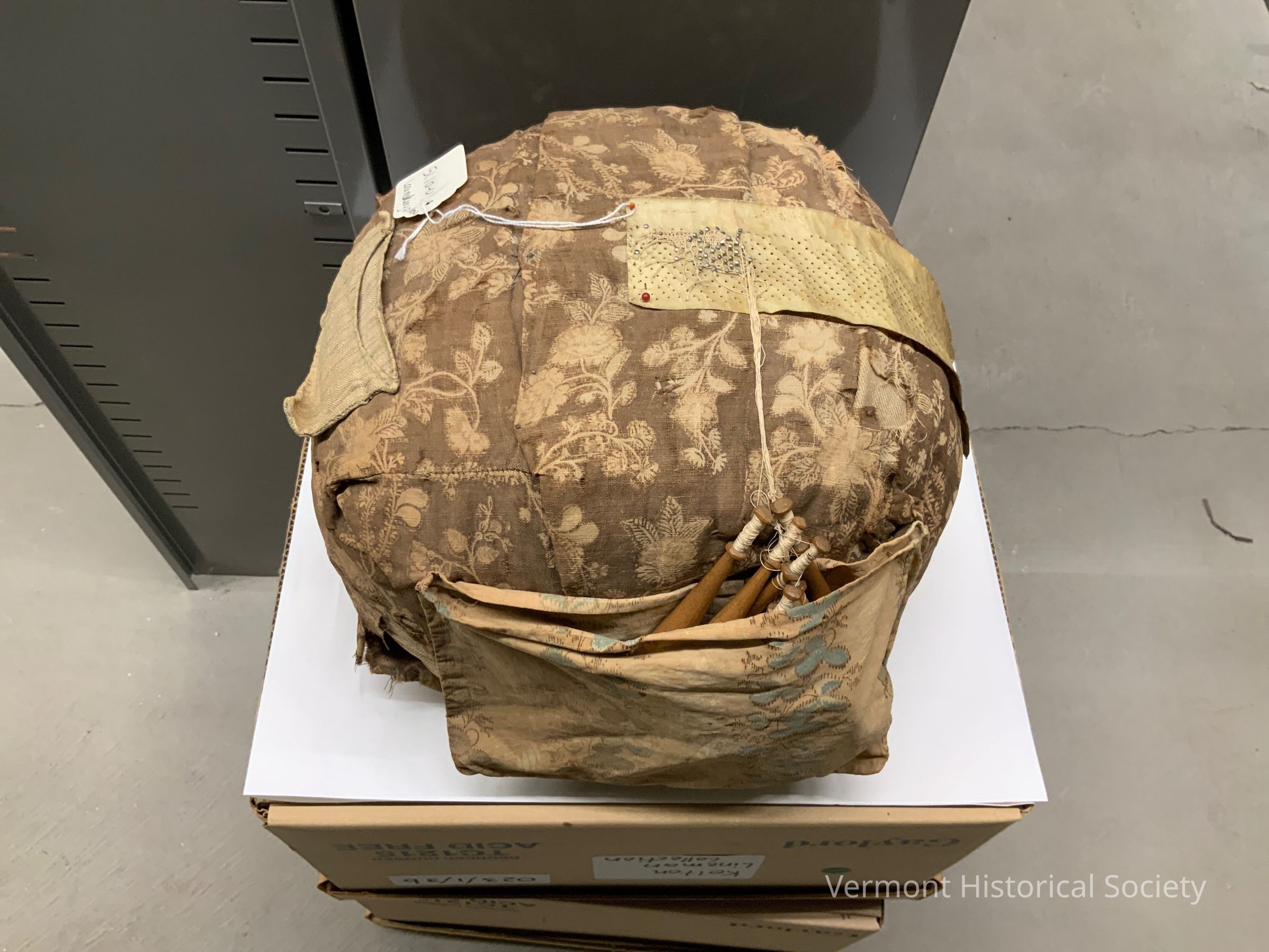 Spherical, tightly padded lacemaking pillow. The pillow is covered with strips of printed cotton sewn together. The cotton has a faded floral pattern printed on brown cotton ground. There are two pockets sewn to opposite sides of the pillow, one of blue and white floral printed cotton and the other of blue and white striped ticking. A strip of perforated paper is attached at the top of the pillow perpendicular to the sewn cotton strips, and at the top edge of the paper several pins have been inserted with threads woven between them to create a small length of lace. The lace bobbins attached to the threads are tucked into the printed cotton pouch at the side.Context