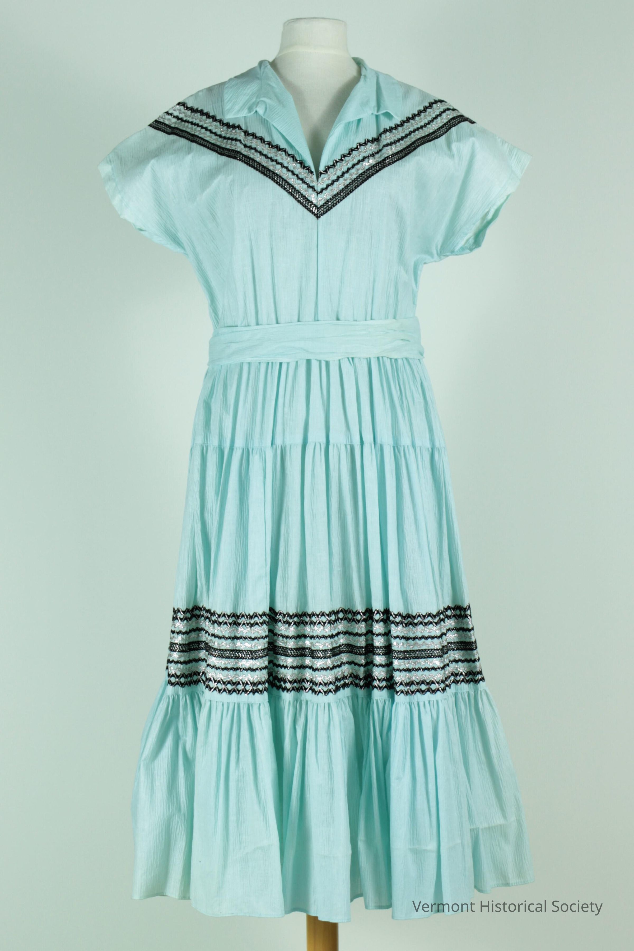 Blue or aqua cotton dress decorated with black and silver rickrack. The bodice has a falling collar and kimono-cut sleeves. The elastic waist is hidden beneath a self-fabric tie. The skirt is cut in three tiers, each gathered to the one above.Context