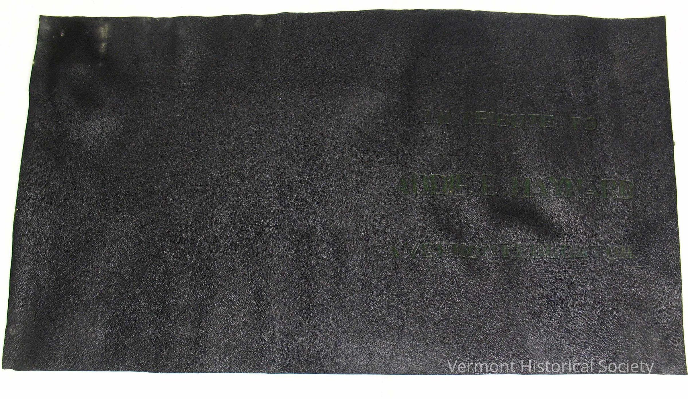 Rectangular sheet of black leather. The right half is stamped with the inscription, "IN TRIBUTE TO ADDIE MAYNARD A VERMONT EDUCATOR" in green. On the back is the inscription, "MADE IN GREAT BRITAIN" written in chalk.