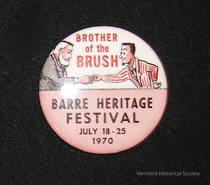 A round, pink-and-white button showing two men shaking hands. The top half of the button shows two men and "BROTHER of the BRUSH" written in red. The man on the left has white hair and a full beard and is wearing a grey suit. The man on the right has black hair and a small chin beard and is wearing a red-and-white striped suit. The bottom half of the pin is pink with "BARRE HERITAGE / FESTIVAL / JULY 18-25 / 1970" written in black.Context