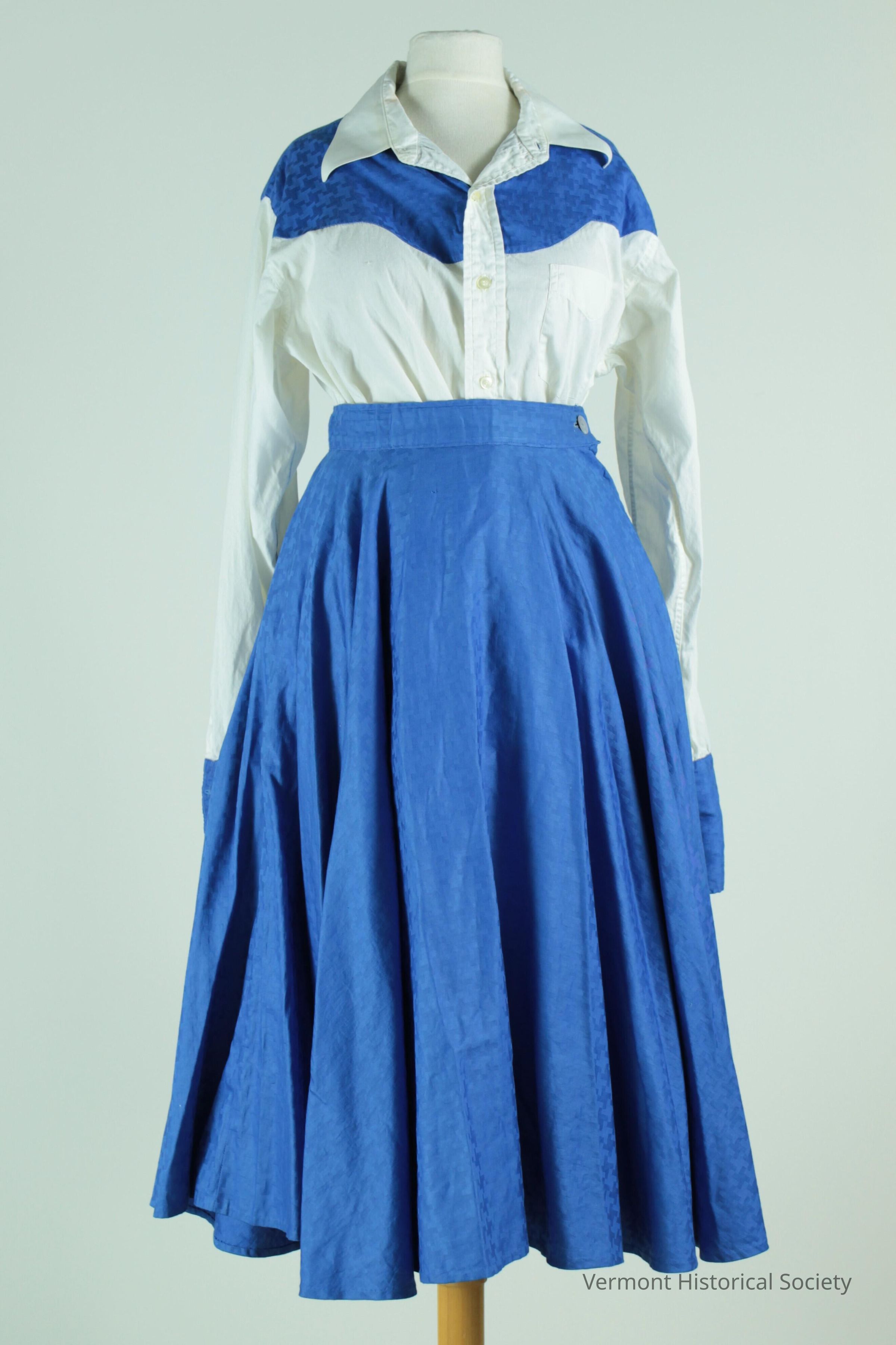 Blue circle skirt. The skirt has a wide waistband that secures at the side with a button above a zipper. There is a pocket set into the opposite side seam. The inside of the waistband has a "gripper" band of couched braid.Context
