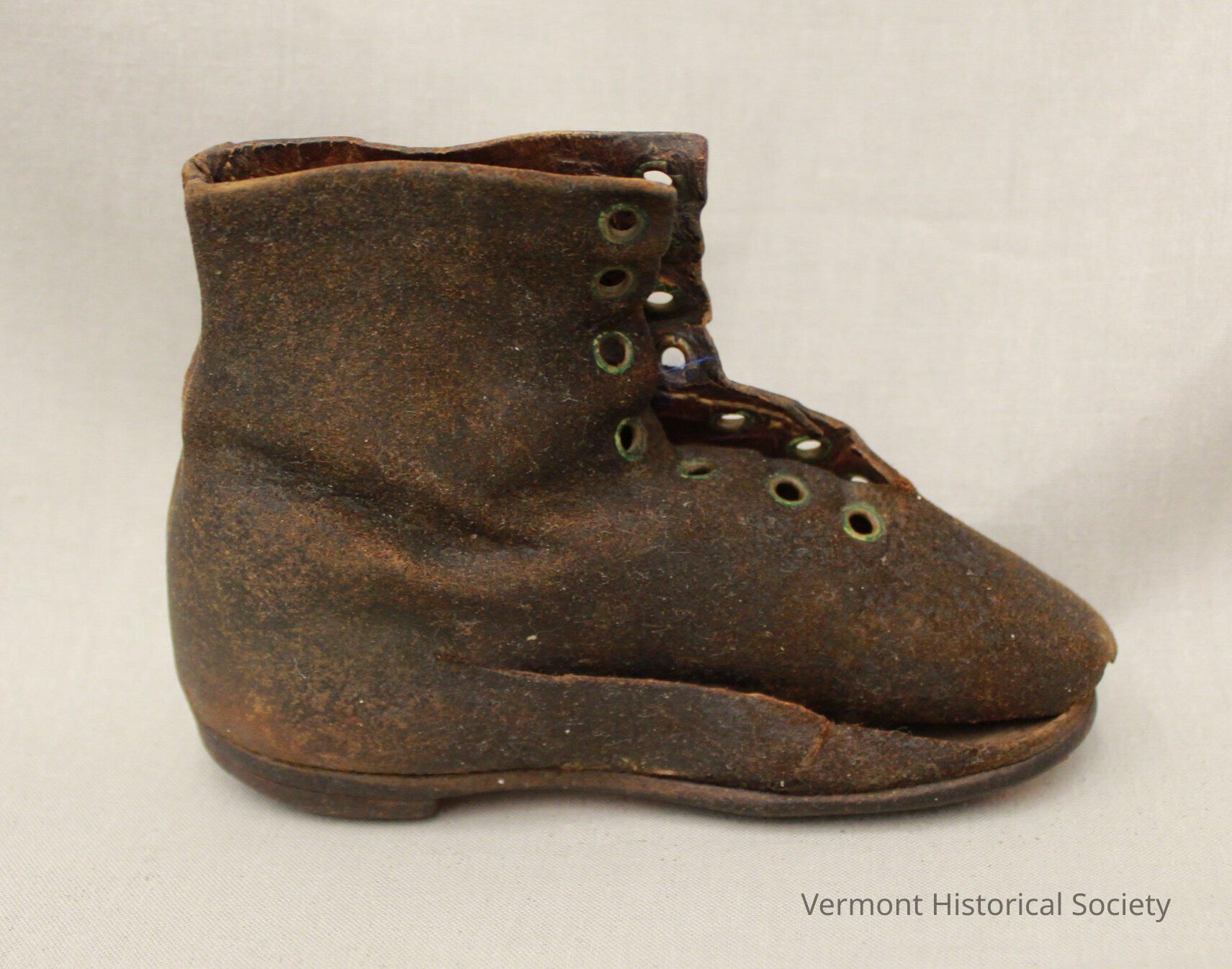 Small leather child's shoe. The upper is made from two pieces of leather, seamed at the center back. There are 7 metal eyelets on either side of a center front split. It has a short, stacked leather heel.