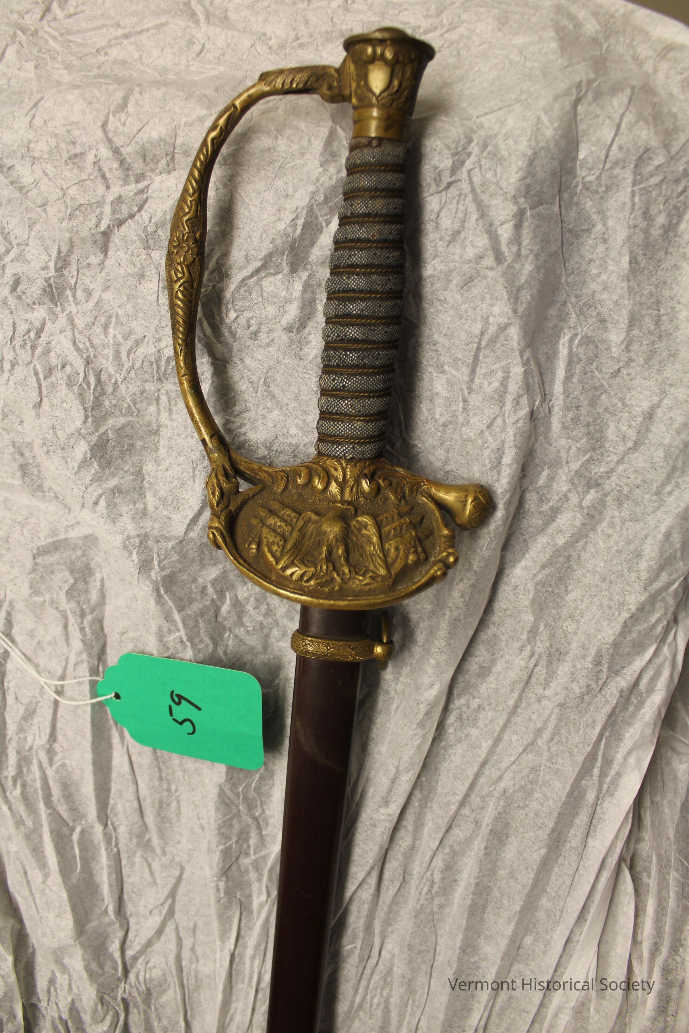 Straight-bladed steel sword and scabbard. The grip is shagreen wrapped with twisted wire. The pommel and guards are brass and are elaborately molded with decorative motifs including an American eagle over six crossed flags.