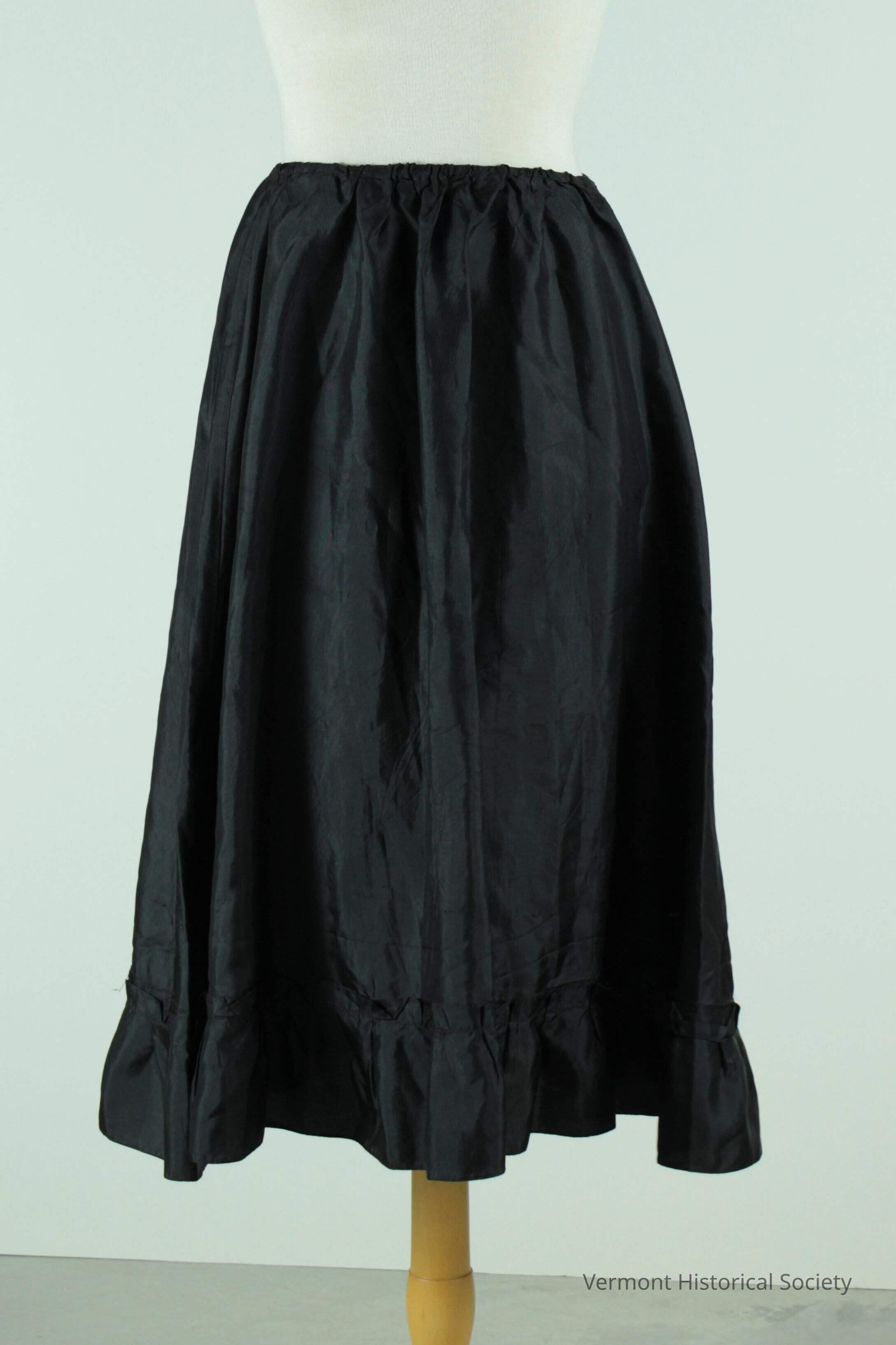 Black satin skirt slip. The waistband is encased elastic, and there is a 4-3/4" ruffle at the hem.Context