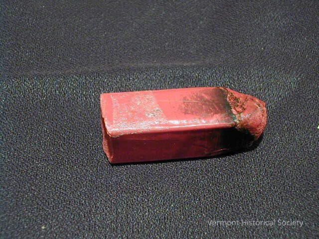 Partially used rectangular stick of sealing wax. One end is broken into a flat edge. The other is charred and melted into a tapered edge.