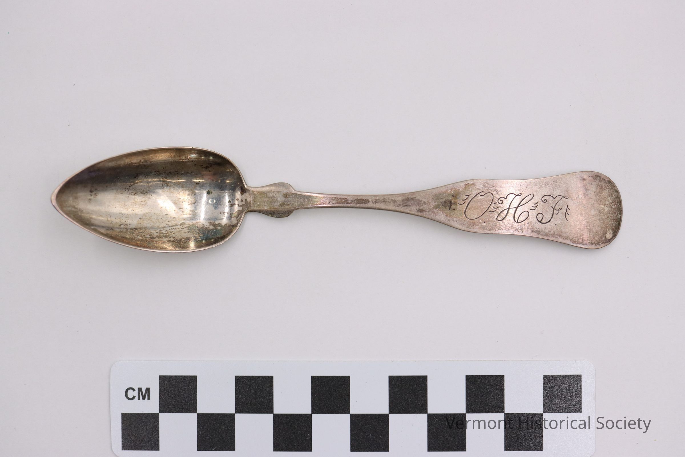 1 of a set of 7 silver teaspoons. The handle is engraved with the initials "O.H.F." The reverse is marked with the name "H. M. NICHOLS." inside a scalloped-edged rectangle.