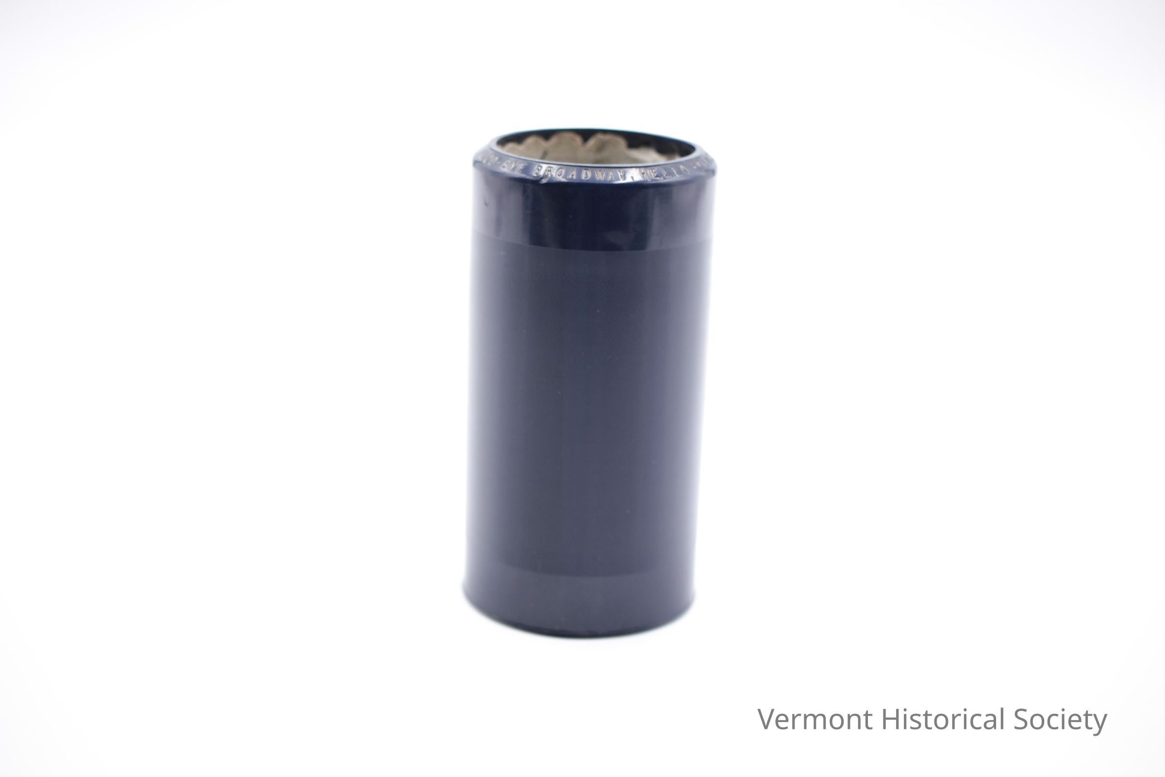 Blue phonograph cylinder with a cardboard case. The cylinder, or "record", is a hollow cylinder consisting of hard, blue, ridged celluloid around a concrete core. One edge of the cylinder is labeled in white with the words, "GOODBYE BROADWAY HELLO FRANCE / Thomas A Edison PAT'D. 24 3321".Use