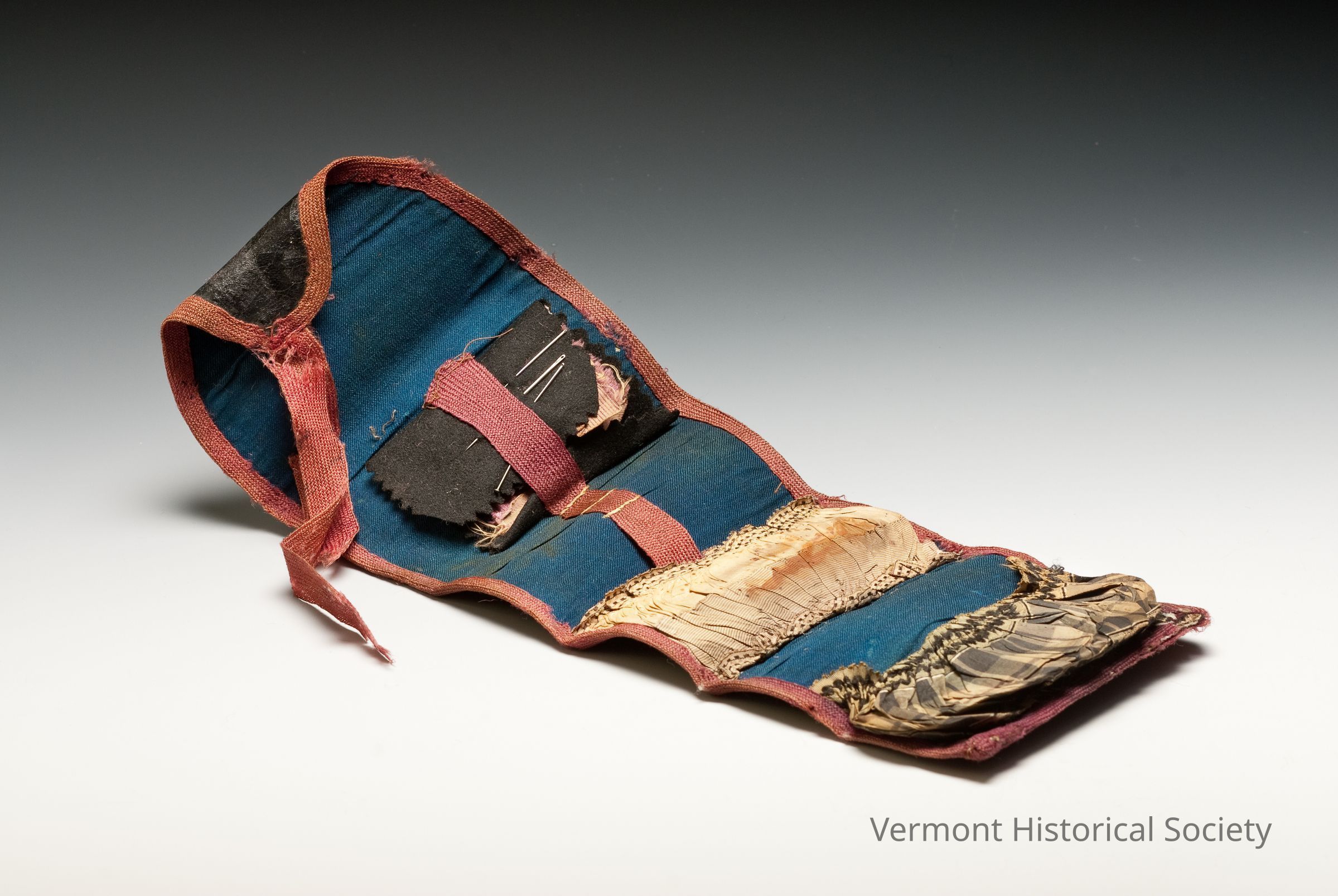Black oilcloth-covered needle case. The rectangular case closes by rolling up and tying two red wool tapes that wrap around the width of the roll. Inside, the case is lined with blue silk and has two silk pockets, both cut fully. The central pocket is cream ribbed taffeta, and the bottom pocket is green plaid taffeta. Above the pockets are a black felt flap (for storing needles) and a red wool tape stitched with channels (for storing tools).Context