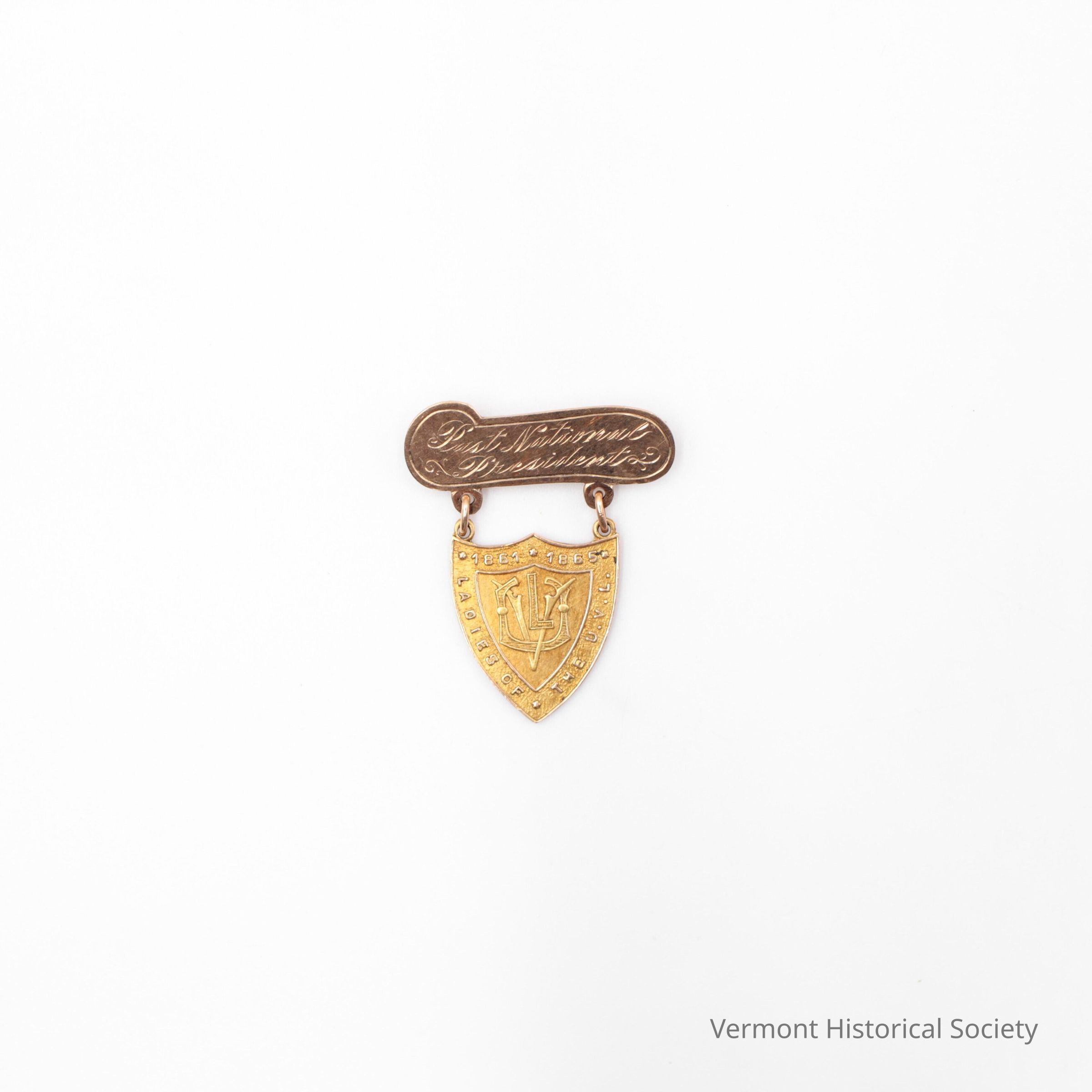 Gold membership pin consisting of a bar and medallion. The bar is engraved with the words, "Past National President". The medallion is shield-shaped and molded in the center with the monogram UVL and around the edge with the inscription, "1861 1865 / LADIES OF THE U. V. L." The reverse of the medallion is engraved, "Nellie Harrington 1921-1922". The pin is accompanied by a photographic postcard showing a man and a woman sitting in ladderback chairs on a porch. A newspaper article about Calvin E. Harrington being elected senior vice national commander of the union veterans' legion is pasted to the other side of the postcard.