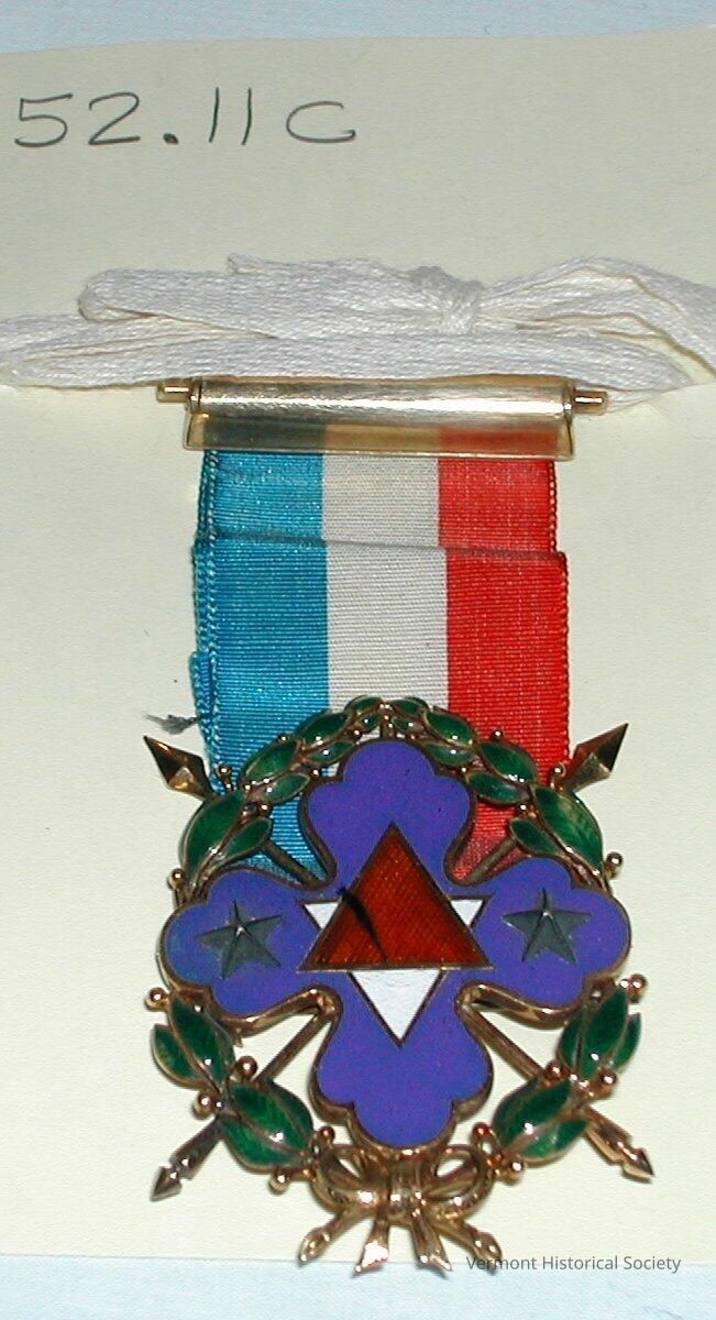 Medal consisting of a bar, a ribbon, and a medallion. The bar is undecorated, and the ribbon loops over a wire on the back. The ribbon is plain-woven and striped blue, white, and red. From the bottom of the ribbon hangs an enameled medallion showing a blue quatrefoil within a wreath. There are two gold stars on the quatrefoil (indicating the rank of Major-General) and a red triangle in the center. There are crossed spears at the back. The reverse of the medallion is engraved, "Maj. Genl. Wm. F. Smith Com. dg. 18th Army Corps/ Major U.S. Engineers presented by officers of his staff".Context