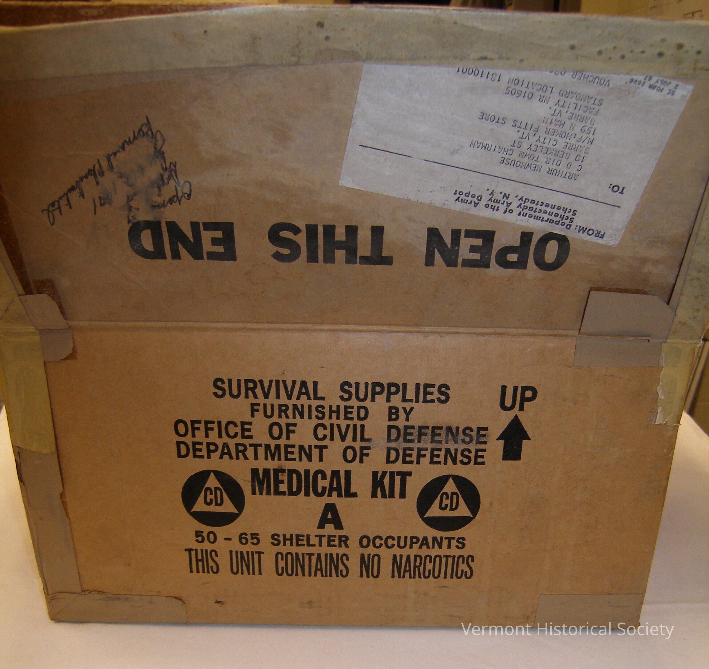 Box containing items making up a Fallout Shelter Medical Kit from the Office of Civil Defense. The box is made of brown corrugated cardboard with a mailing label reading, "FROM: Department of the Army/ Schenectady Army Depot/ Schenectady, N.Y./ TO: Arthur Newhouse/ C D Dir Town Chairman/ (his address)/ M/F: Homer Fitts Store/ 159 N Main/ Barre, VT./ - - - " Handwritten in black ink: "Opened by./ D-- / June 17, 1971/ Removed Phenobarbitol".