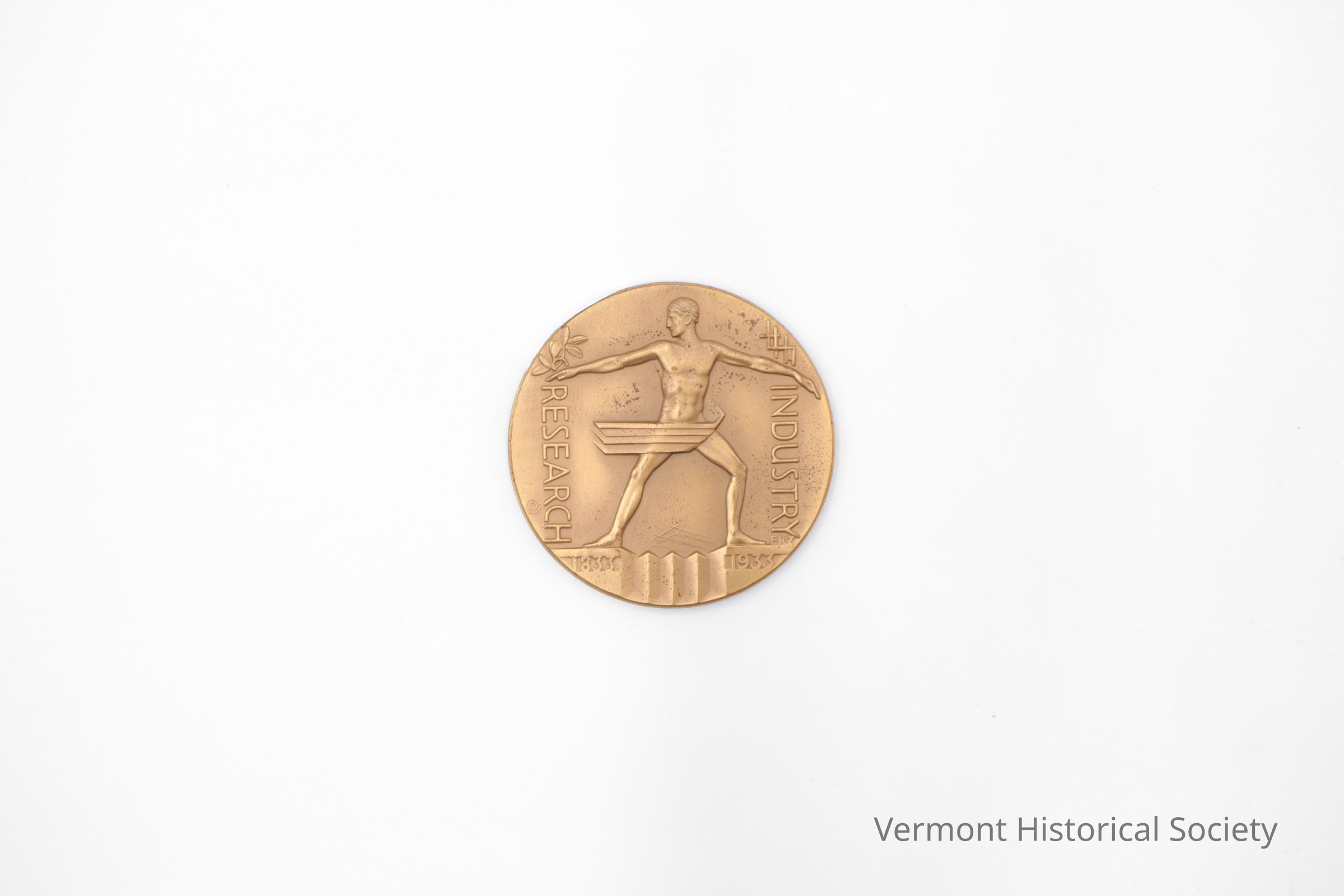 Bronze medallion with an image of a lunging man flanked by the words "RESEARCH" and "INDUSTRY". The other side of the medal has a map of the shoreline of Chicago, Illinois, with the inscription, "A CENTURY OF PROGRESS INTERNATIONAL EXPOSITION CHICAGO 1933". It has its original leather-covered box with the label, "OFFICLA WORLD'S FAIR MEDAL, Inc. / Administration Building / A Century of Progress / CHICAGO".Context