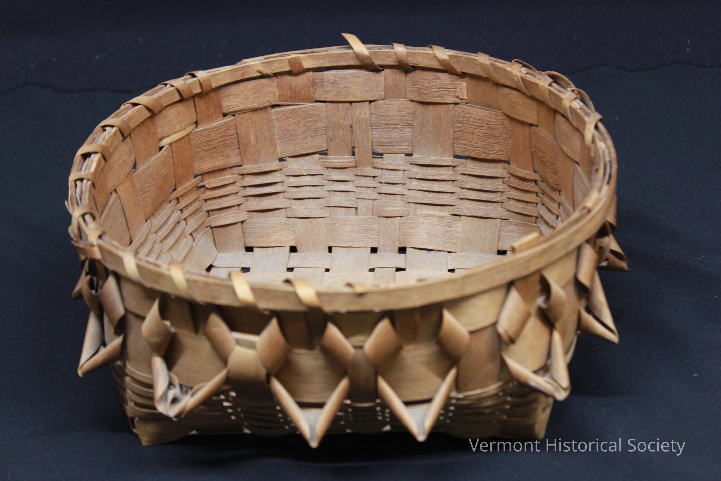 Basket with a round top and square bottom. The basket is made from thin splints of wood in varying width, and the outside is decorated with woven loops, or cowis. It is signed in ink on the bottom, "Leland Krook/Sept 1903".Context